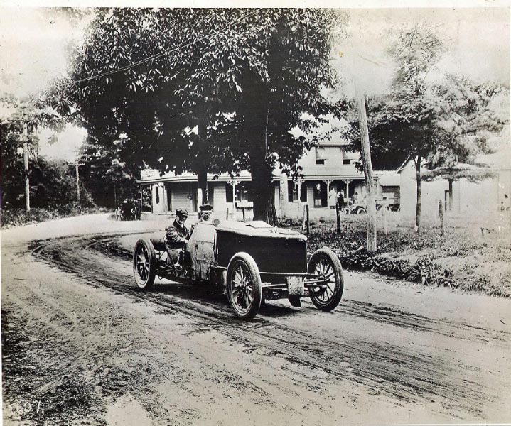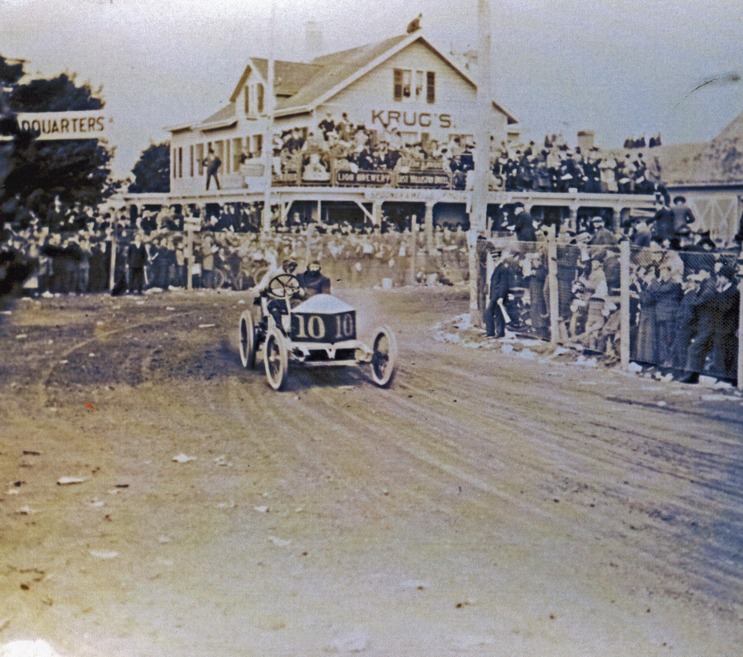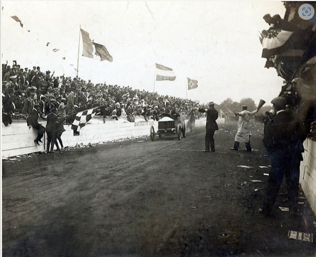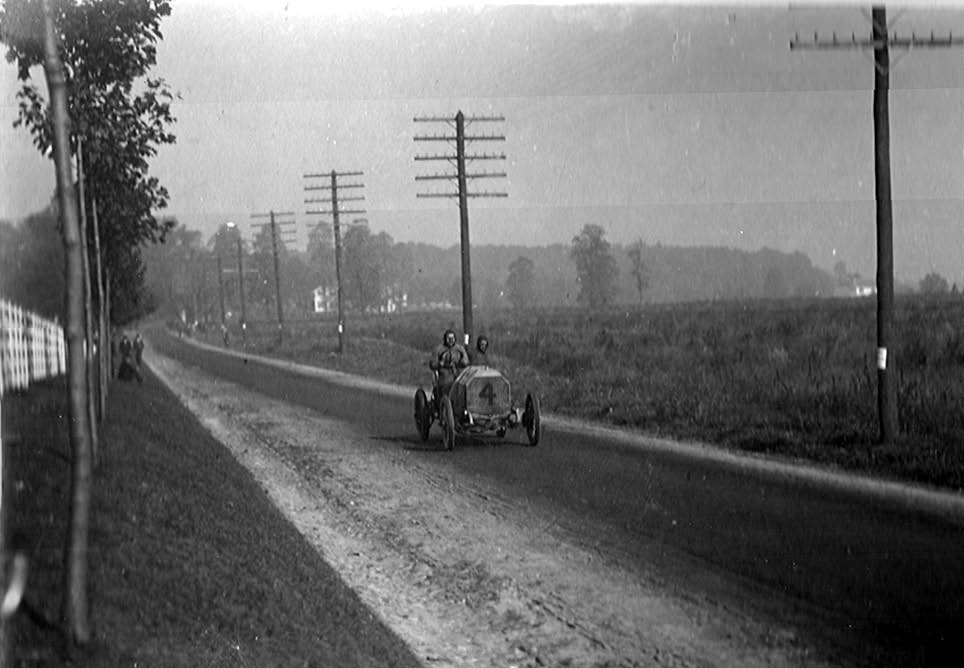 Louis Wagner won the 10 laps of the 297 mile 1906 course in his #10 100 H.P. Darracq in 4 hours, 50 minutes and 10 seconds, roughly about 30 minutes per lap in 1906. Race cars were traveling at a rate of about a mile a minute.