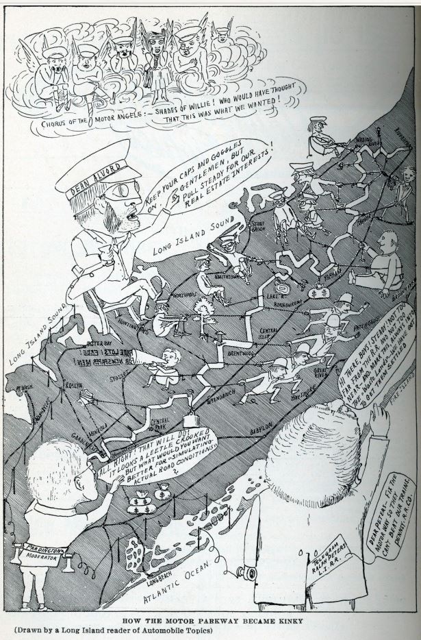 In Automobile Topics in September of 1907, a reader's hand drawn cartoon map shows three of the motor principals explaining why the Motor Parkway was 'kinky' and not the original, proposed straight run.