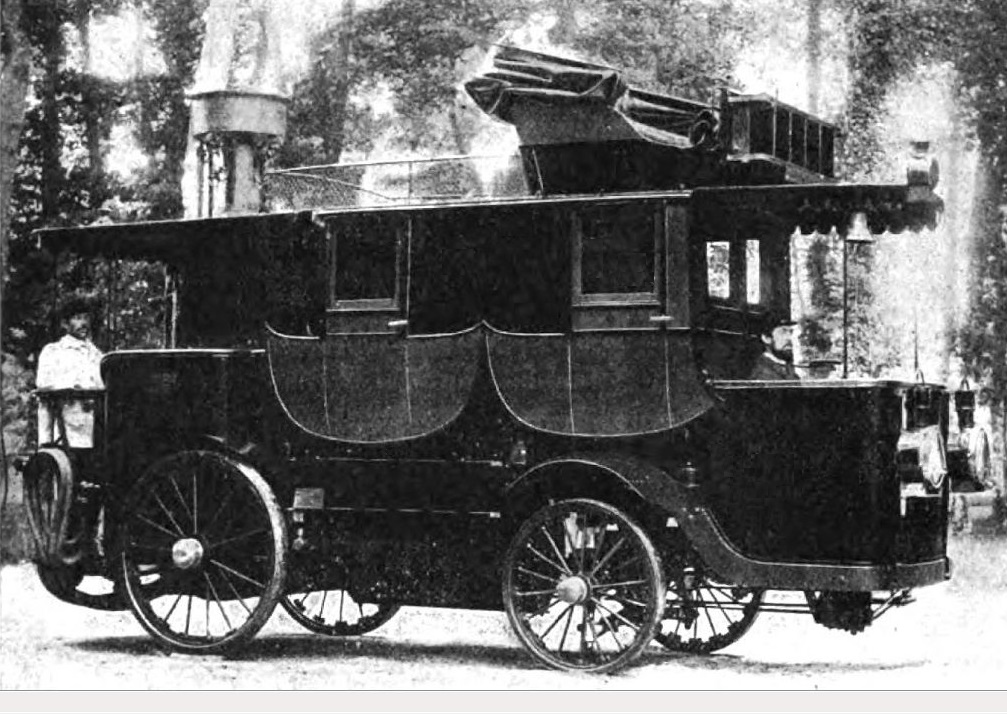 A vehicle two stories tall, weighing a staggering 15,000+ pounds, capable of carrying 16 people with its 50 hp steam motor at 30 km/h (approx. 20 mph) on level ground.