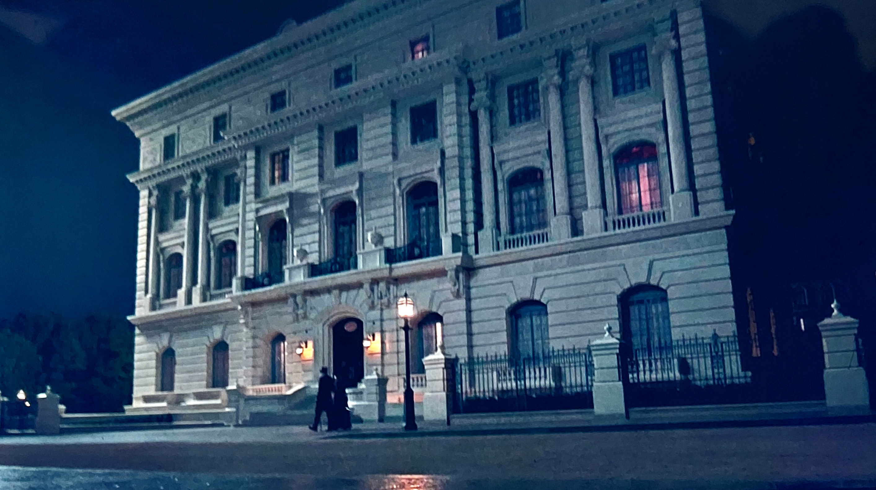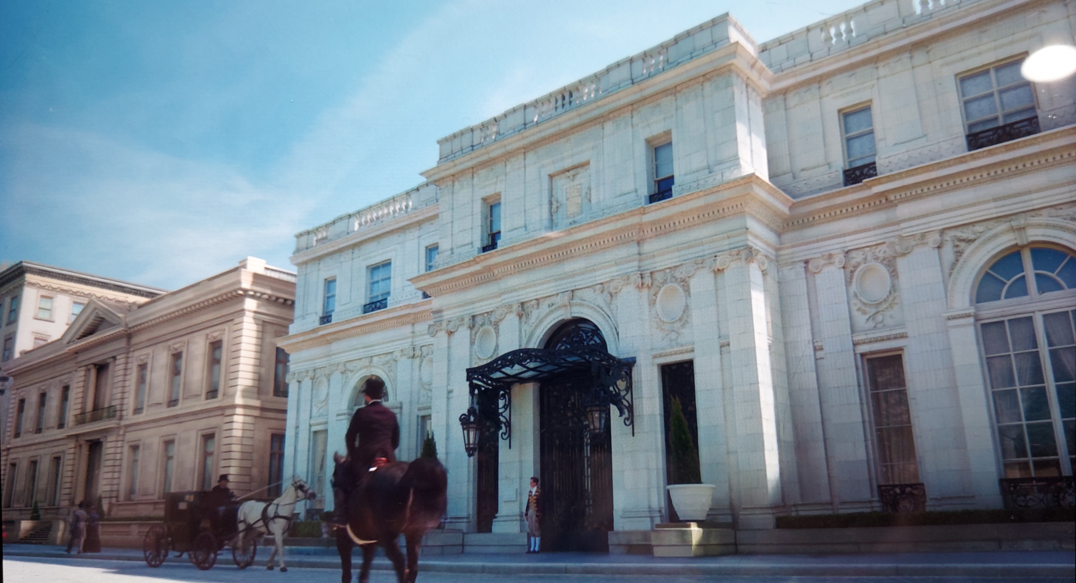 As seen in this still shot from the show, just the right-hand, front entrance of Rosecliff was grafted via CGI to create character Sylvia Chamberlin's mansion in NYC.