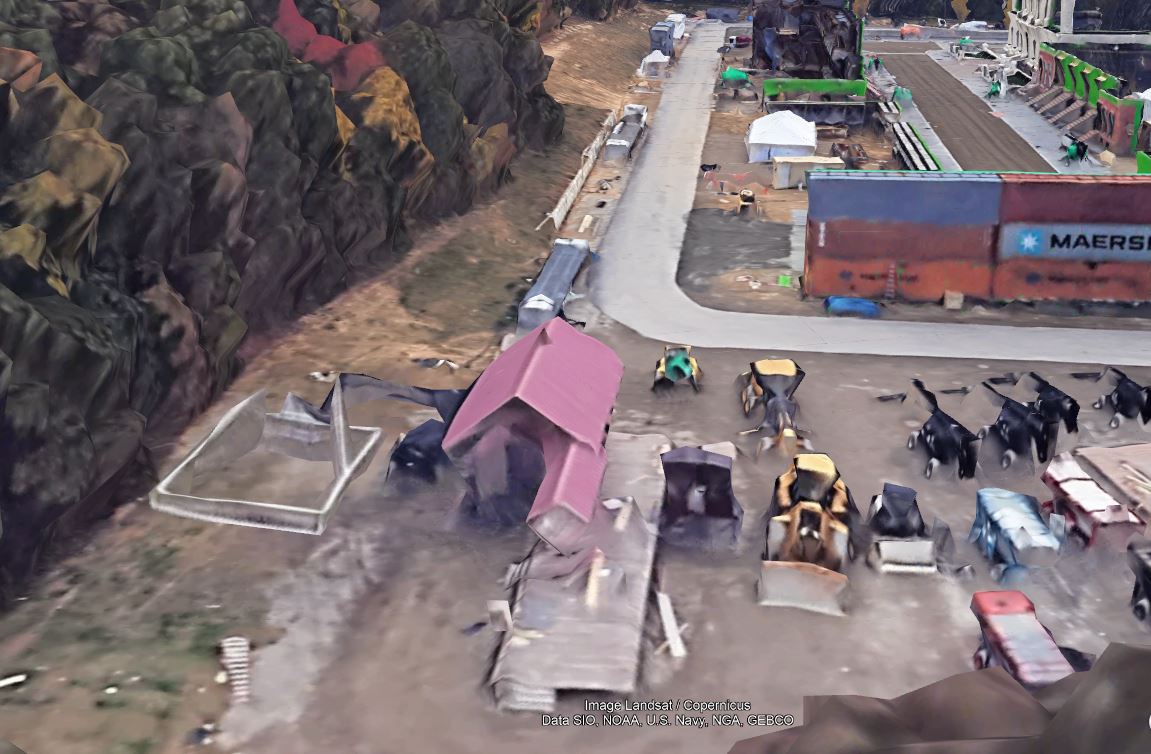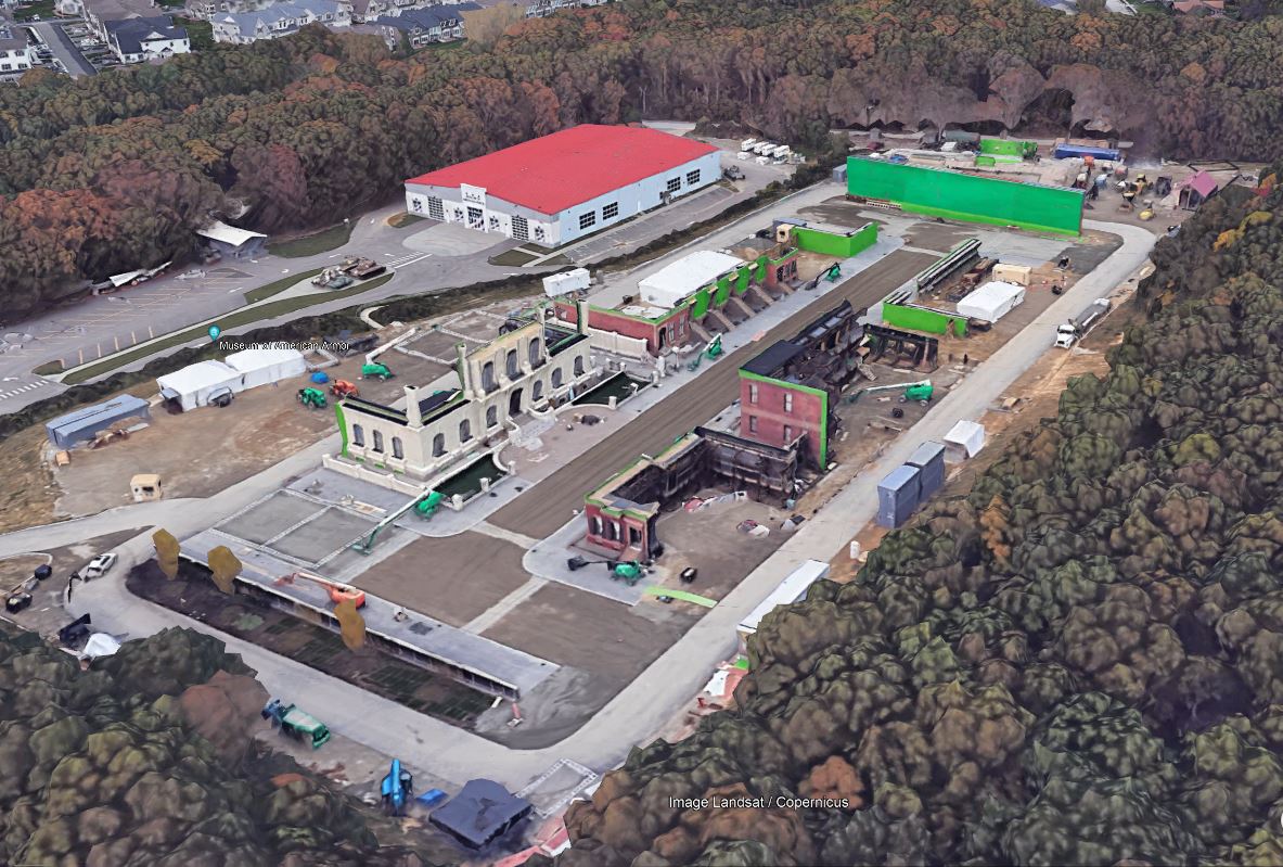 Seen here on Google Earth, the train station depot is tucked away in the back corner of the OBVR set and makes obvious the only real items in the final shot are the structure, people and platform.