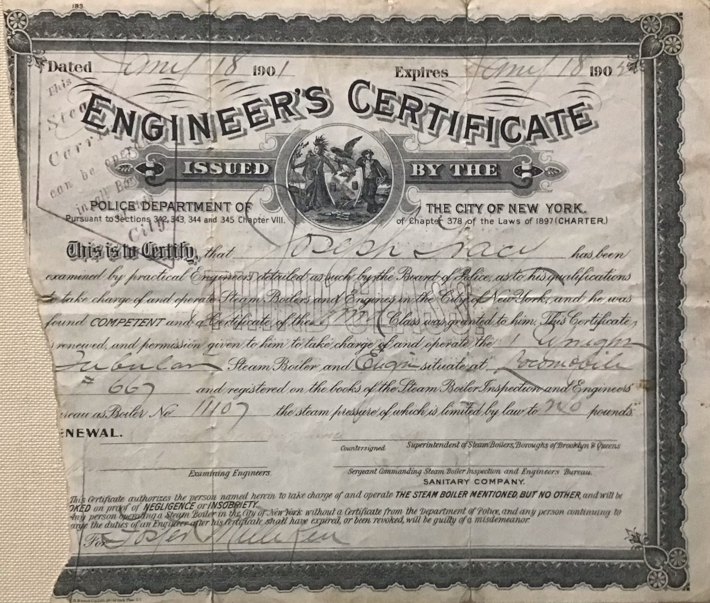 Accomplished Vanderbilt Cup Race driver Joe Tracy gained his engineering certificate for operating steam boilers at Locomobile within the boroughs of New York.
