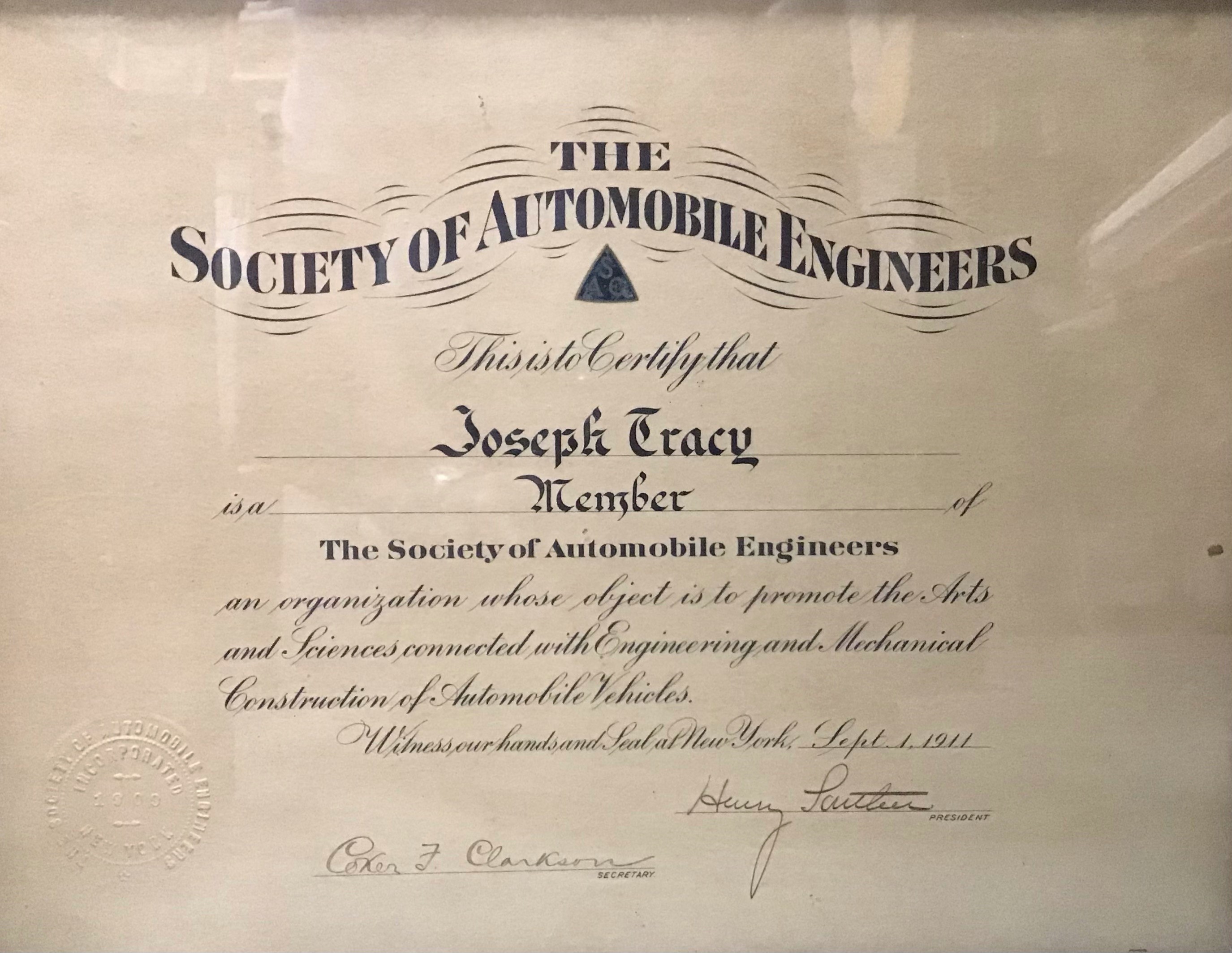 The certificate shown here is from Joe Tracy's acceptance into the S.A.E. on Sept 1st, 1911. By that time, somewhere around 1000 members were now part of the organization and growing by leaps and bounds. Joe was certainly worthy of acceptance since he was so instrumental in all things automotive by that time and his knowledge of steam and internal combustion was a welcome addition.