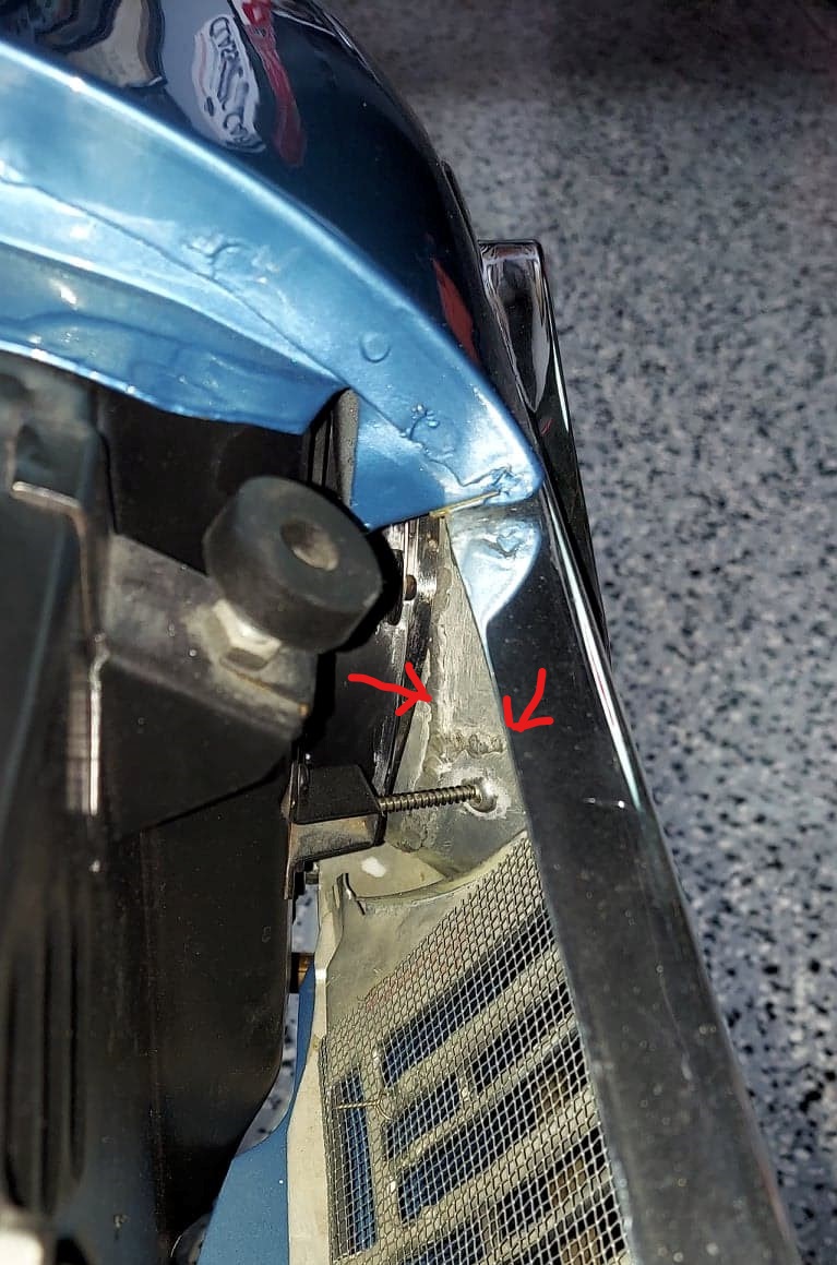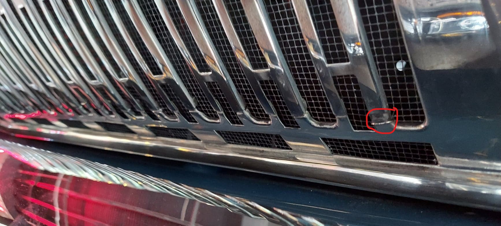 The red circle indicates the spot in which the grill was cut, inches removed and pieced back together. Each upright within the grill receiving the same treatment as seen.