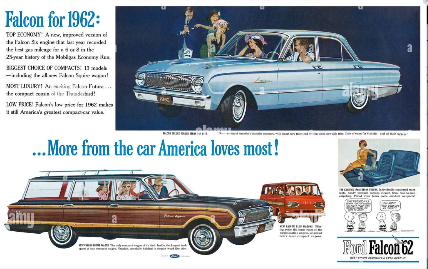 With a small, fuel-sipping 6 cylinder and an extensive array of body configurations, the 1960-1963 1st generation Falcon was an instant hit. Two and four doors, convertible, wagons, Ranchero pickup, Econoline van, and even eventually a unique sedan delivery, there was a model for any family's needs and tastes. And with varying trim levels, one could purchase a basic Falcon all the way up to the luxury Futura package.