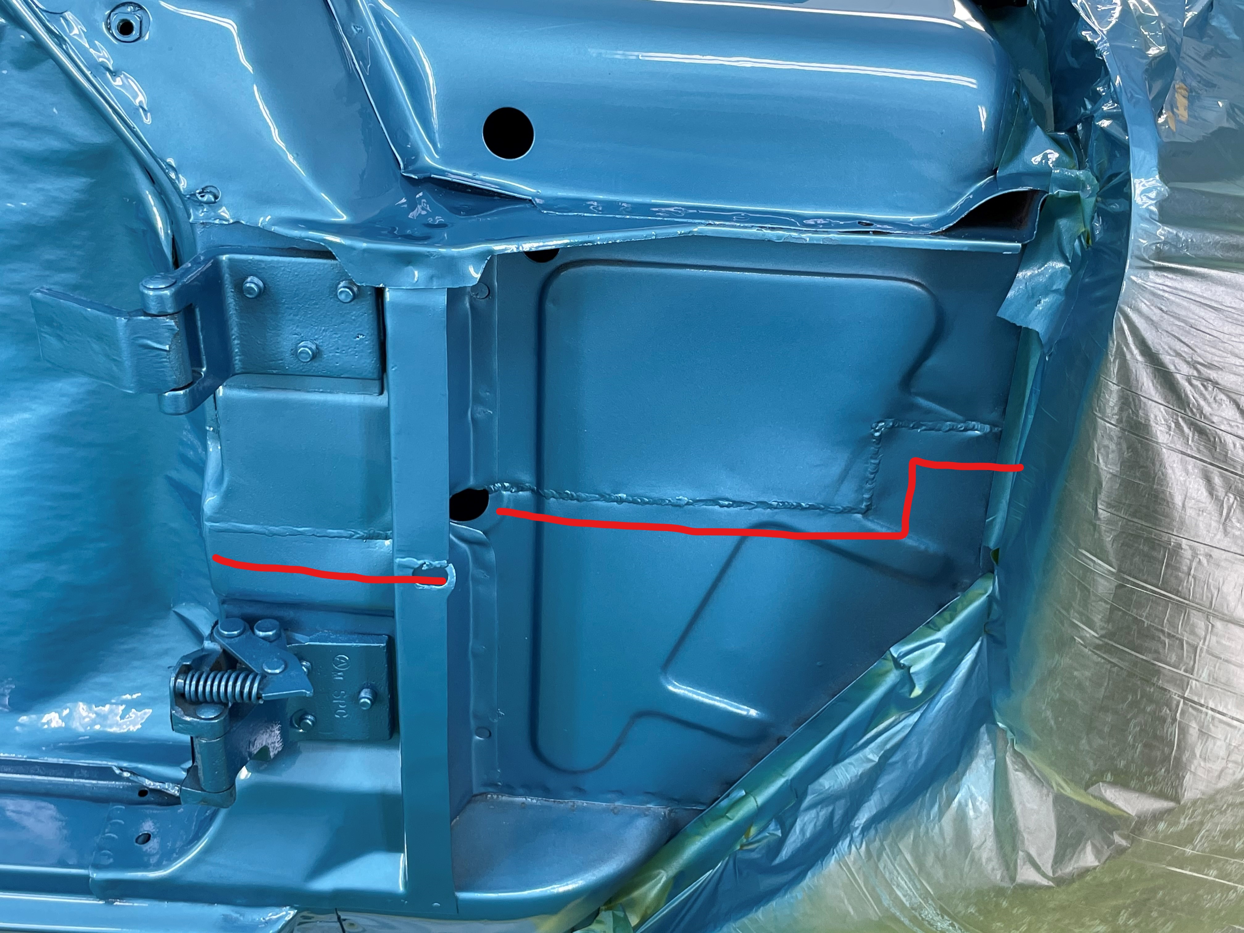 During the Challenger's restoration by Rob Ida at Ida Automotive, one can see the horizontal welds showing just where H/M's master metal fabricator Ludwig 'Lujie' Lesovsky removed the 3 inches behind the front fenders. Red line markings on the photo underscoring said welds.
