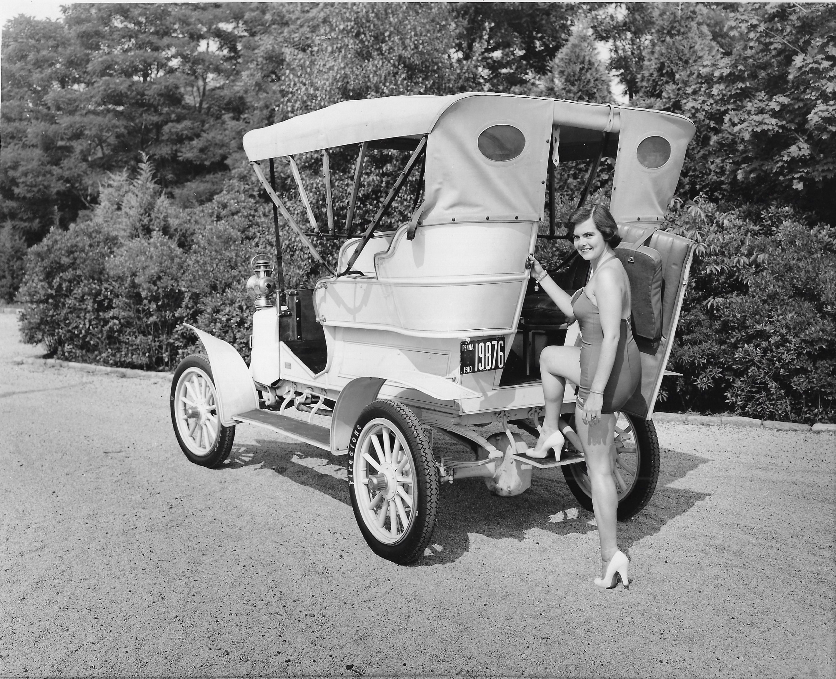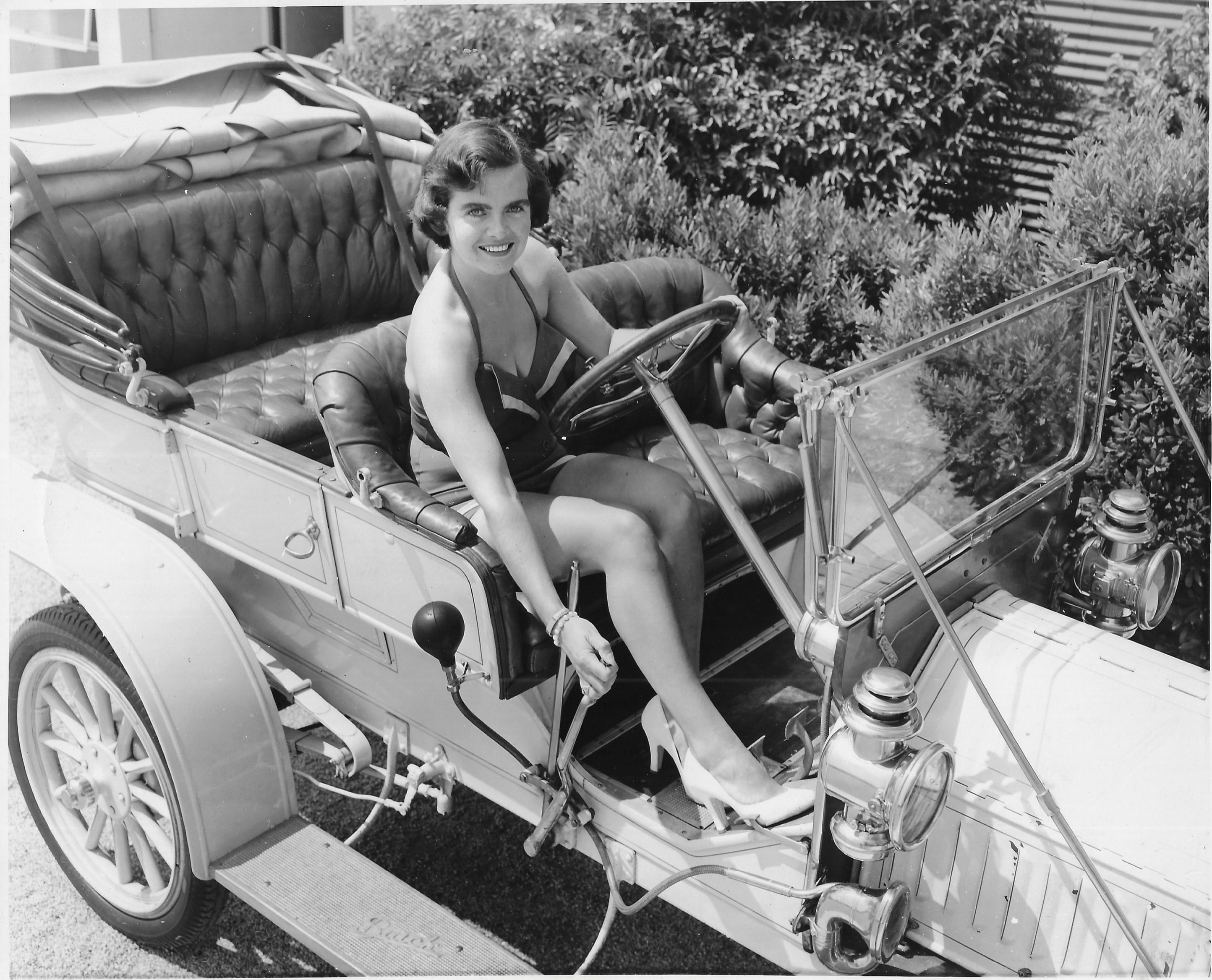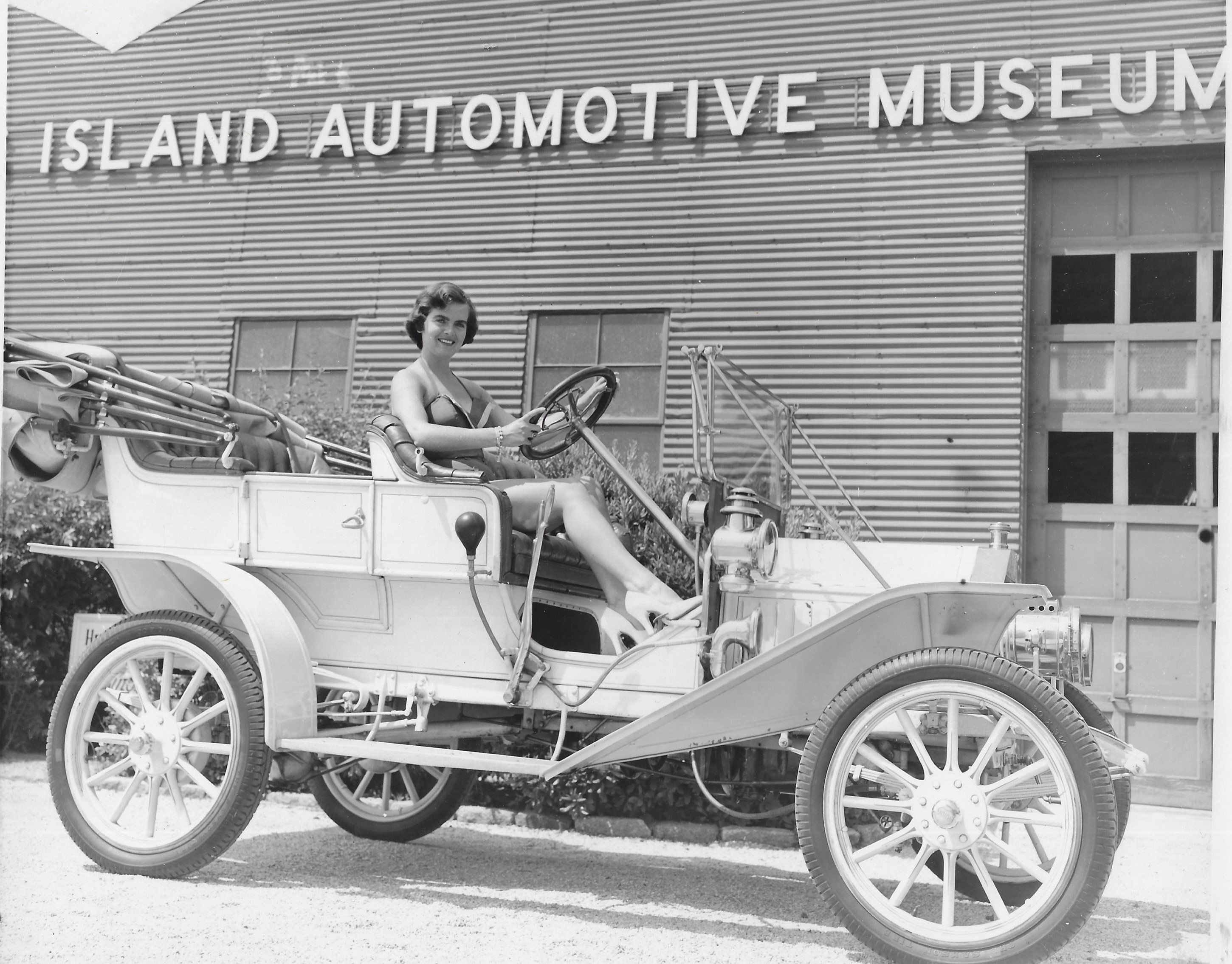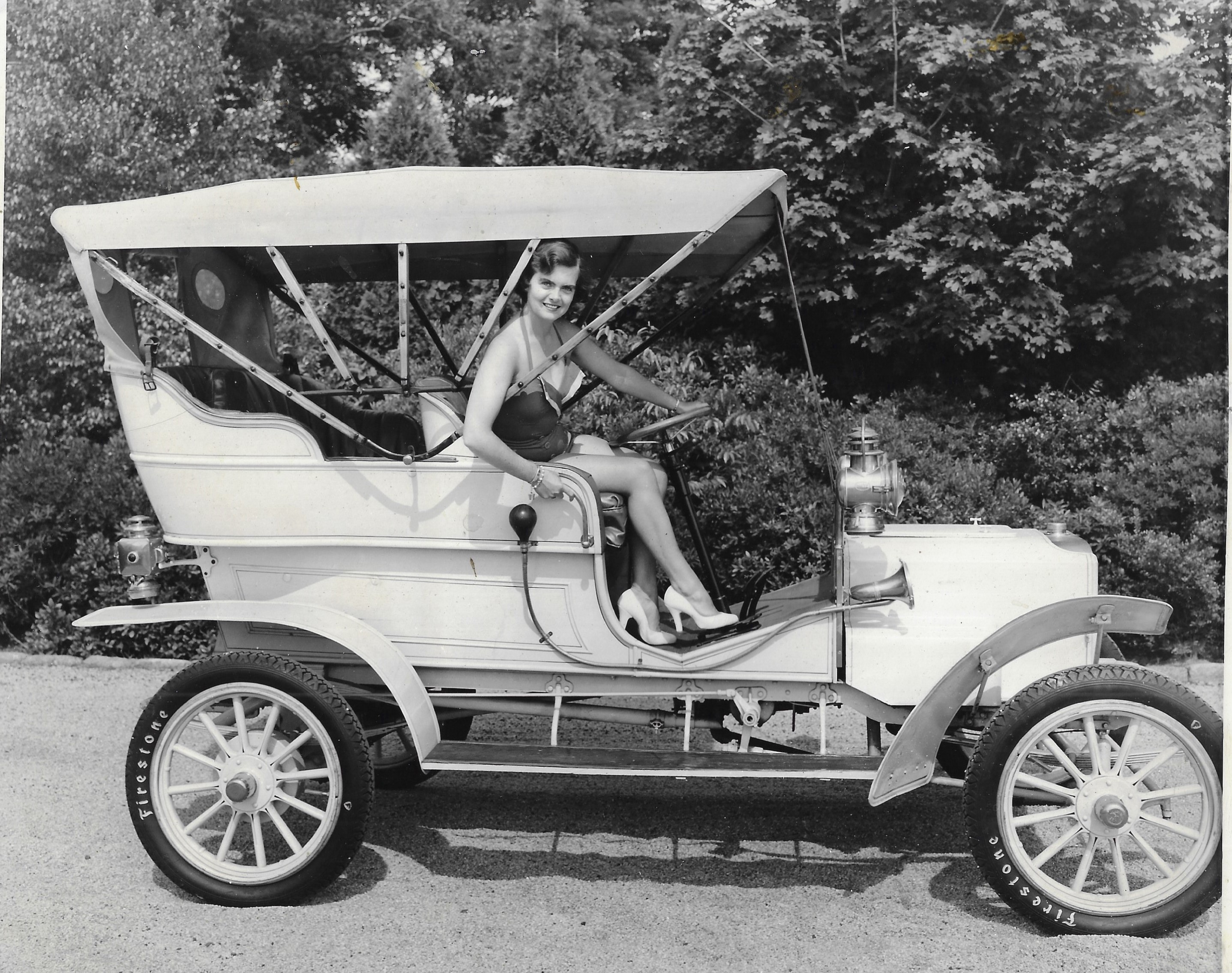 Swimsuit model in front of the museum in 1950 with a 1910 2-cylinder Northern rear-entry Touring car in the background