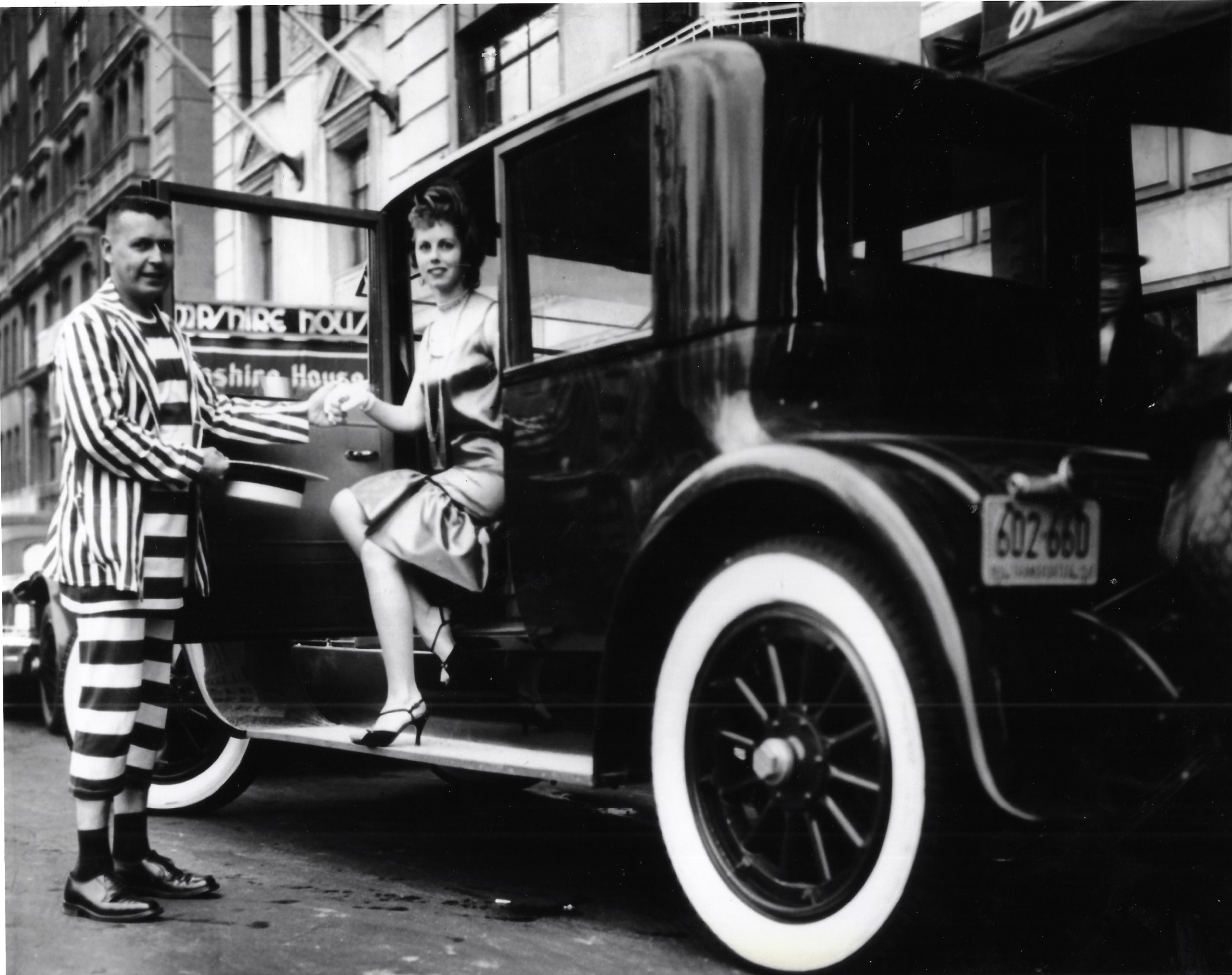 A dandy couple arriving in their 1923 Pierce-Arrow at Austin Clark's Roaring 20's party in NYC