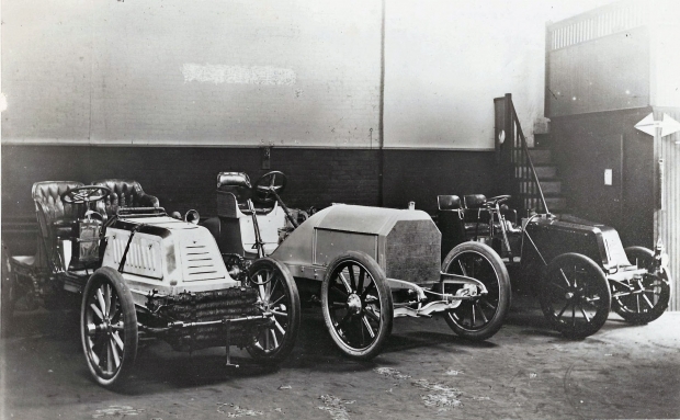 His 1902 60-HP Mors, 1904 90-HP Mercedes, and 1902 Renault seen in Vanderbilt's garage.