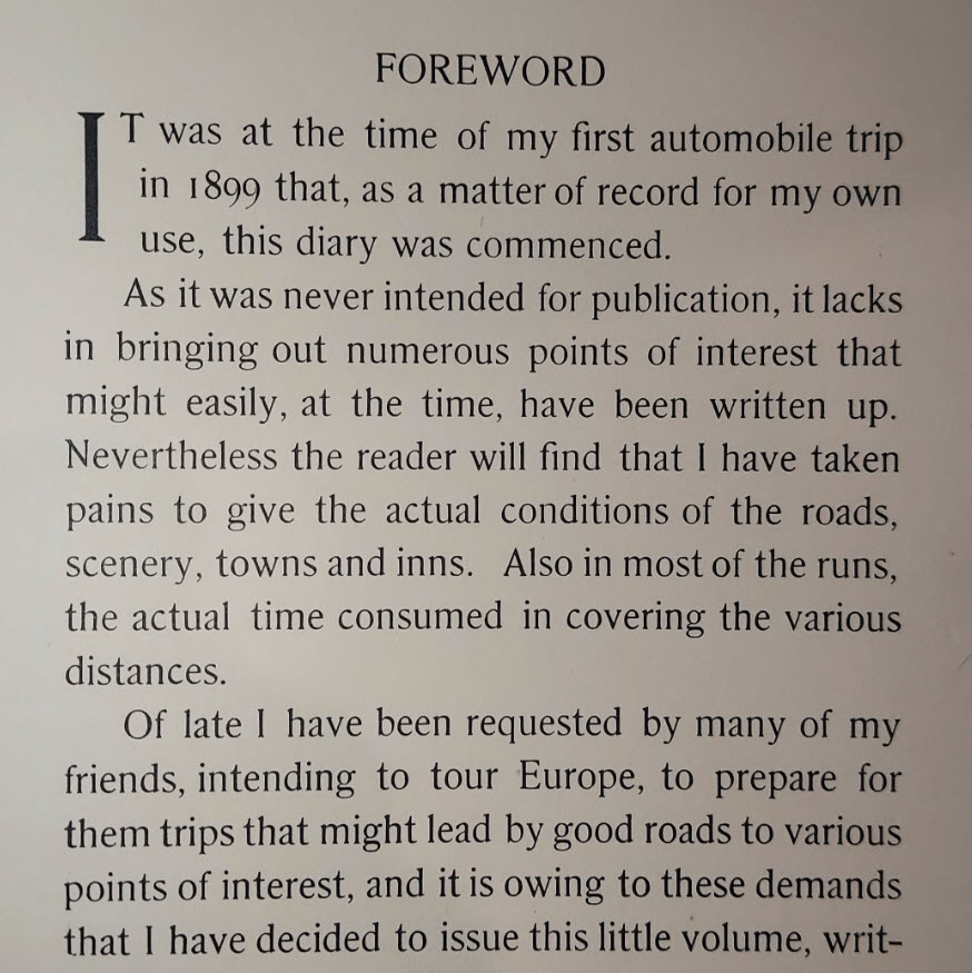 A humble Foreward by Vanderbilt describing he's no author, but just wanted to put together an account of his European travels and racing records for his close friends who requested it.