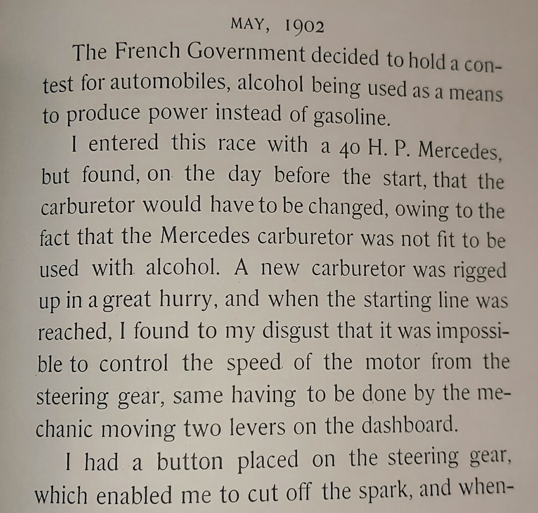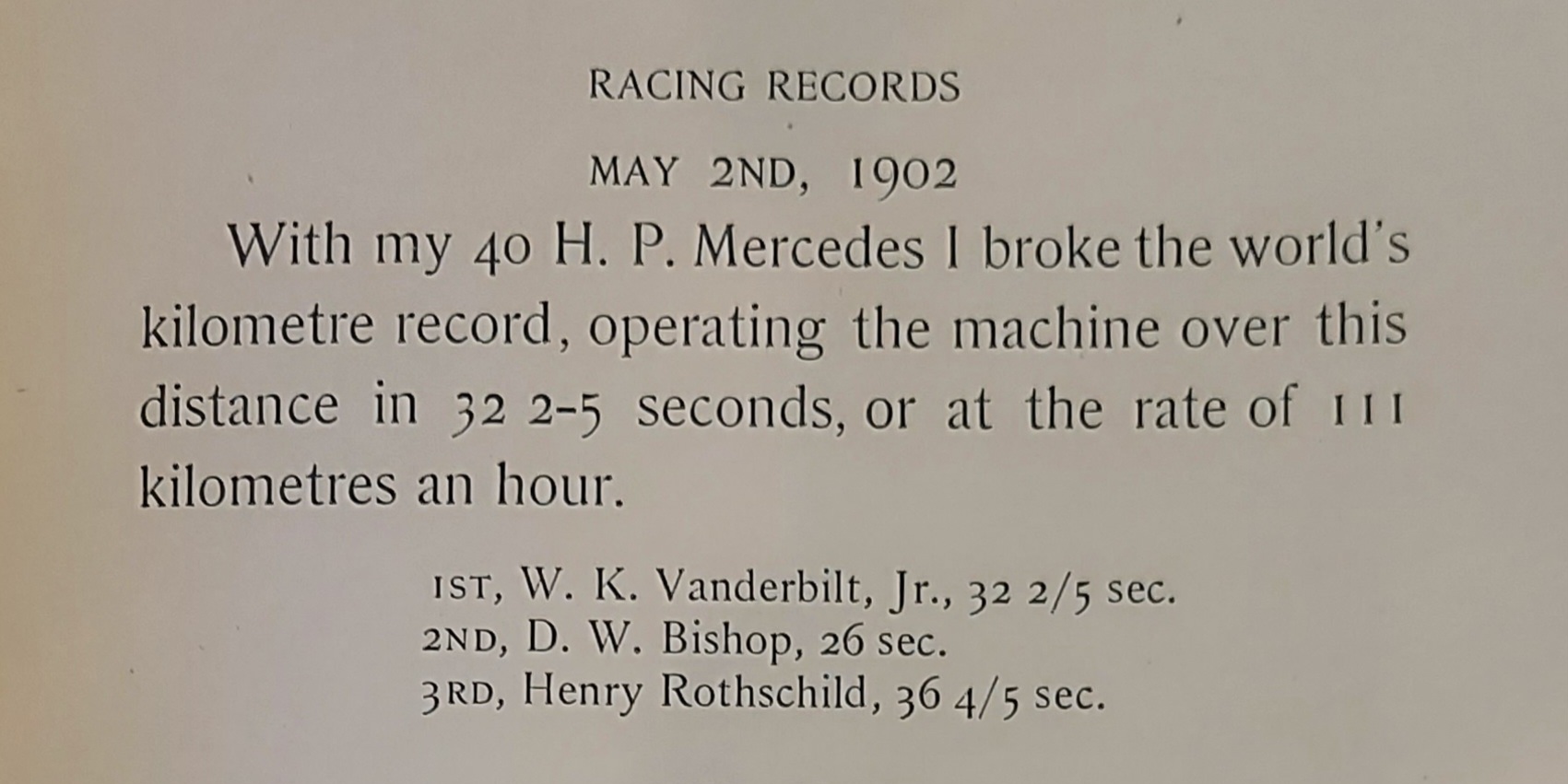 Willie K's next German machine was again a Mercedes, but a new 40hp Mercedes- Simplex this time. On his way to participate in the Circuit du Nord race, on May 2, 1902, Vanderbilt challenged Bishop and Baron Henri de Rothschild to a kilometer match race between Ablis and Chartres.