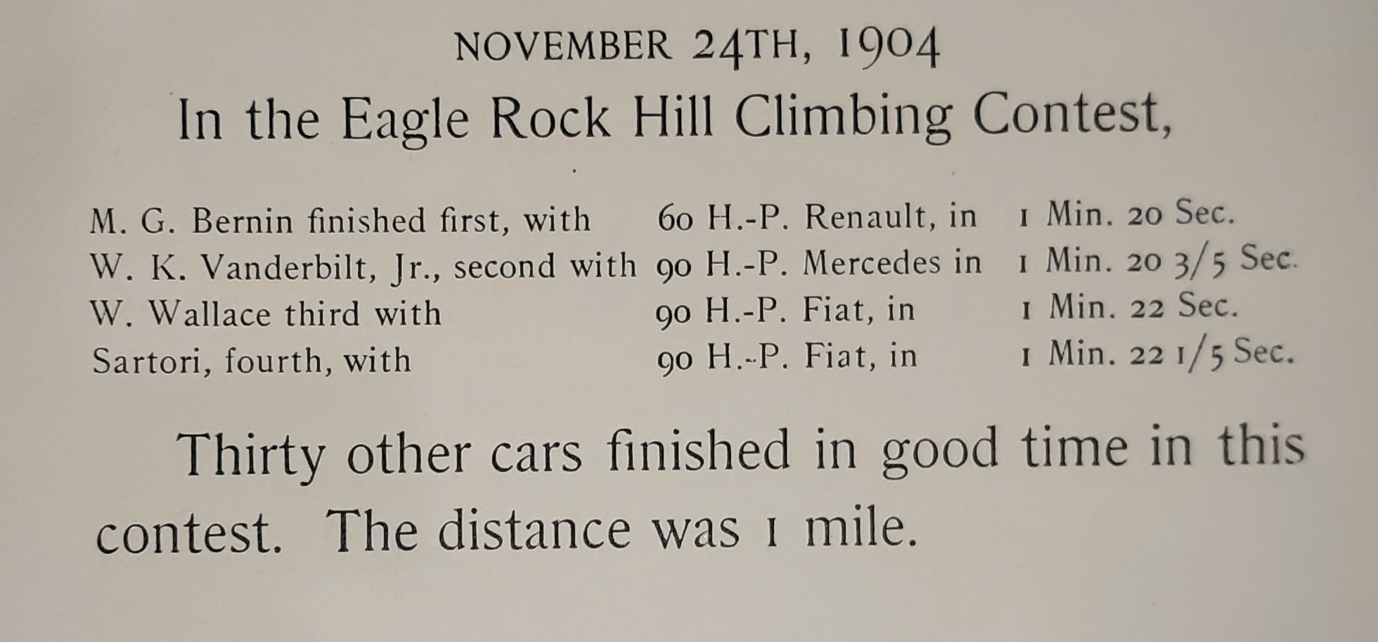On Thanksgiving Day 1903, Vanderbilt took his 60-hp Mors to West Orange, New Jersey, and won the Eagle Rock Hill Climbing Contest.
