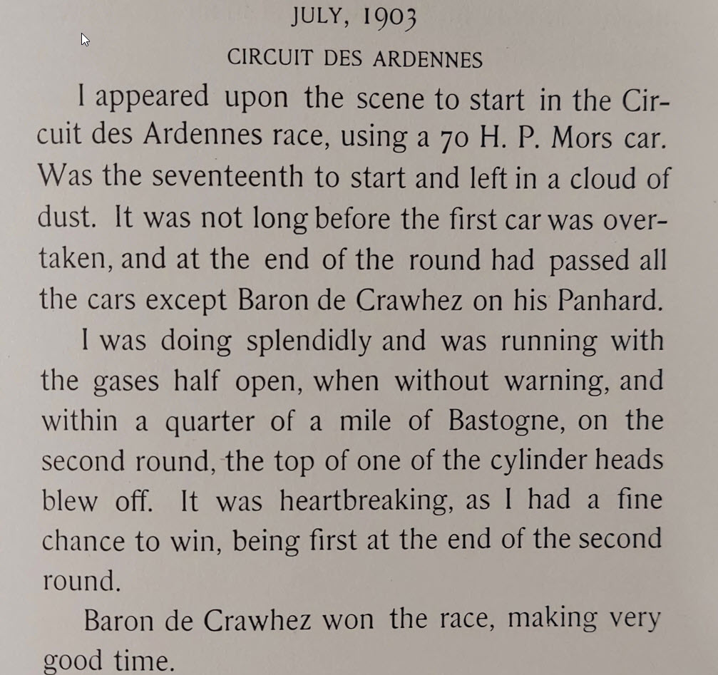 Another heart-breaker for the speed demon at the Belgian Circuit des Ardennes race in 1903. A failed cylinder in the second round found Baron de Crawhez winning and not Willie K.