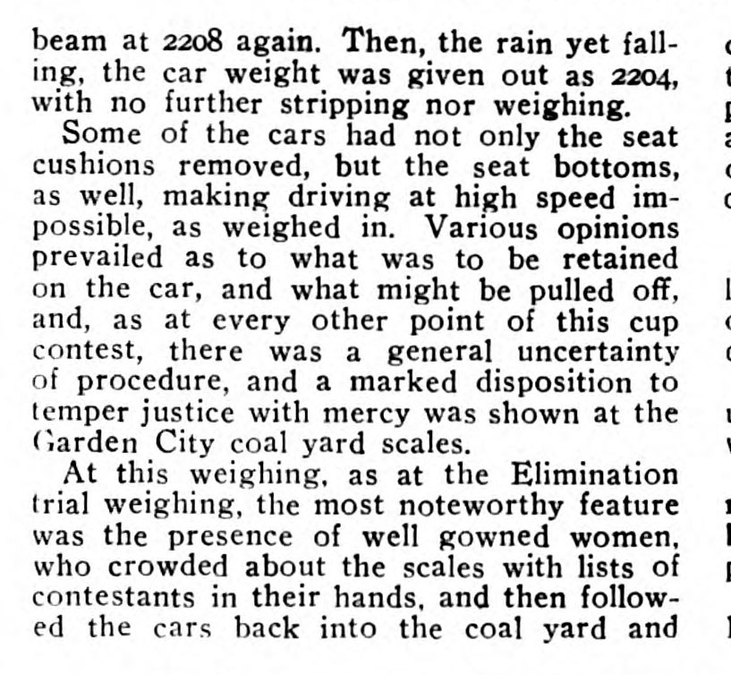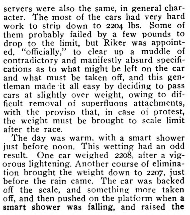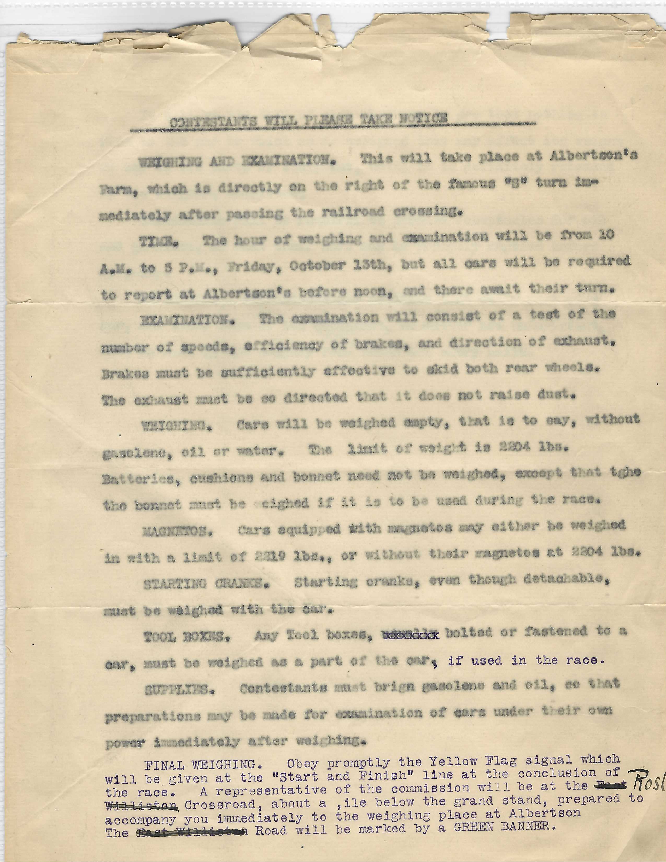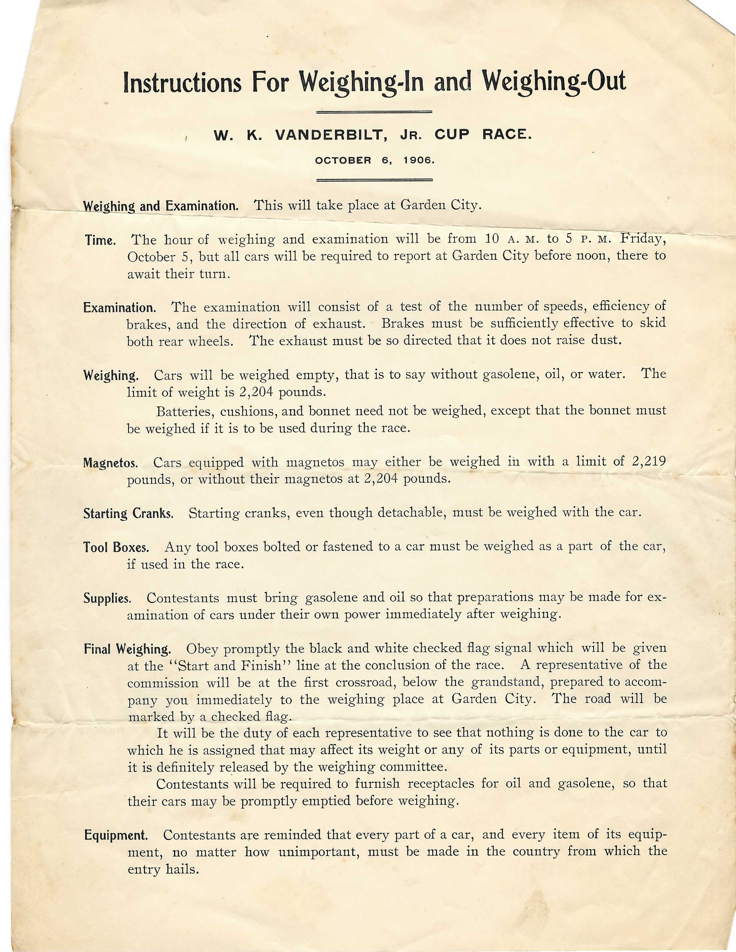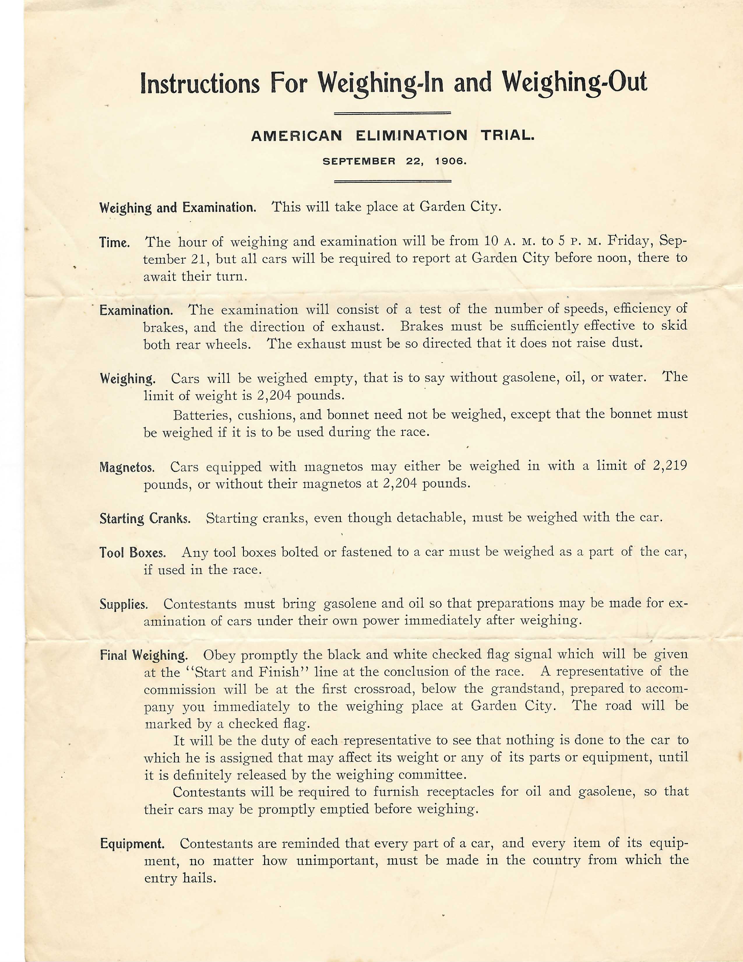 The official instructions for weighing-in and weighing-out of the 1906 American Elimination Trials and Vanderbilt Cup Race. But the weigh-ins and outs were not as cut-and-dry as what was on the sheets handed out to the contestants.