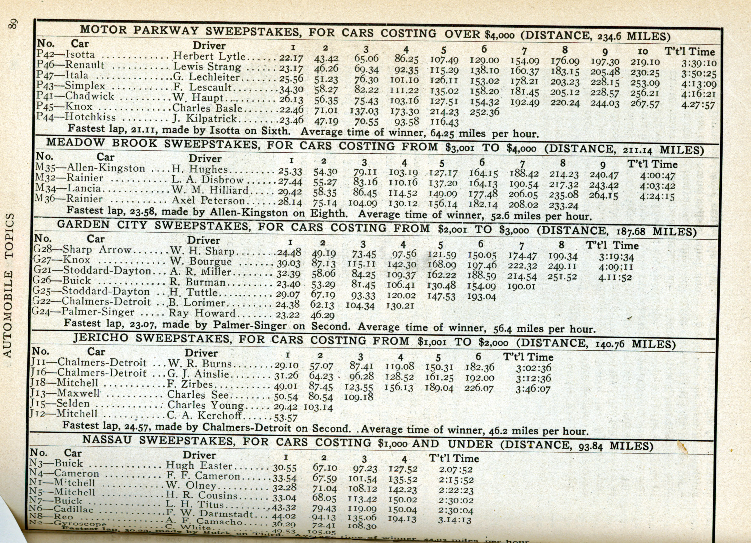 The later Vanderbilt Elimination trials, like these classes in the 1908 American Eliminations race, classified American cars by their retail prices. Of all the things to judge by, retail price of car would seem to be at the bottom of the list. In modern day terms and vehicle nationality aside, a Ford or Chevy could not race a Ferrari simply because they are far apart in retail price despite them being similar in track performance specifications.