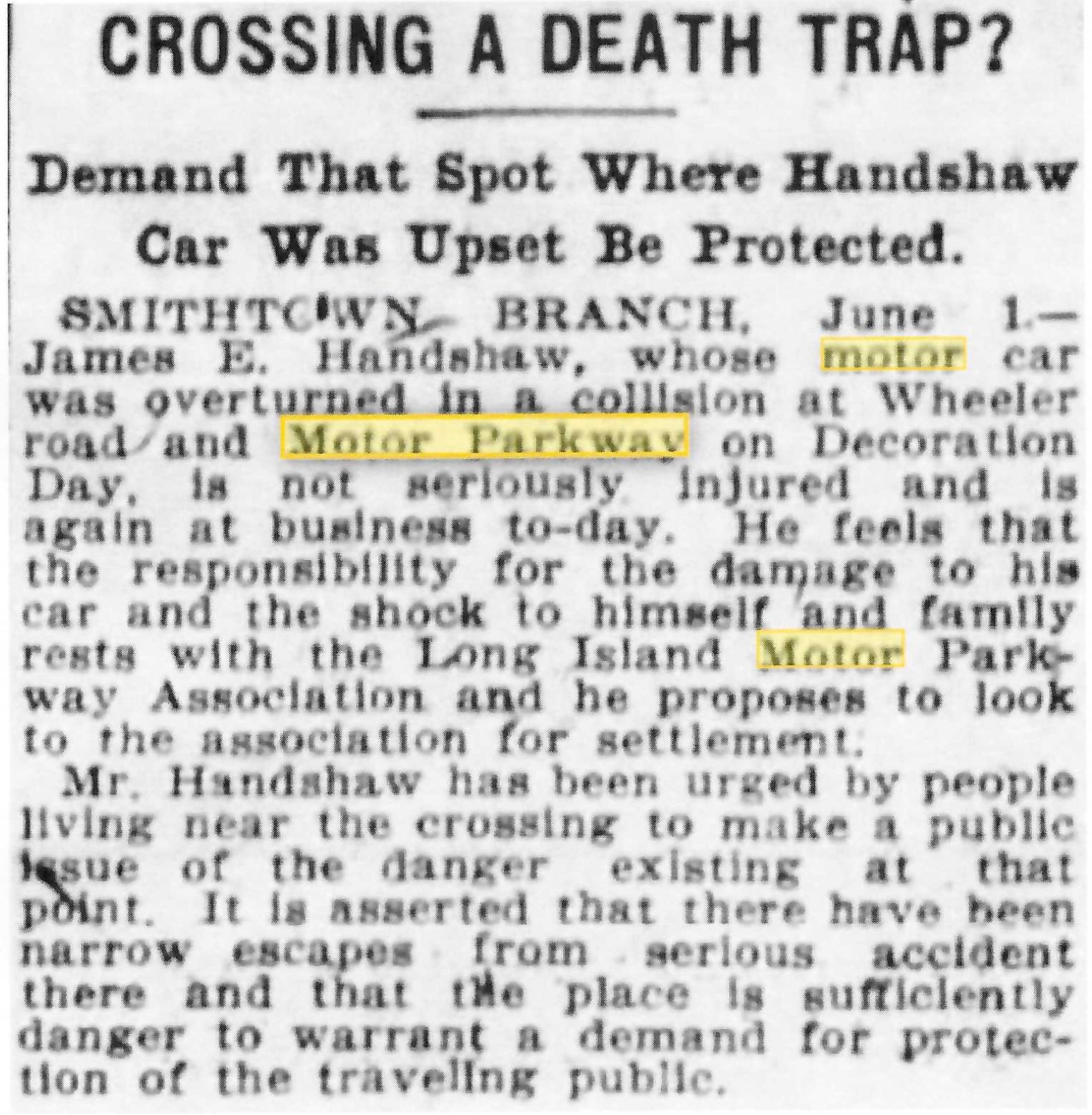Art K. very recently posted about the dangerous intersection and accidents of the Motor Parkway and Wheeler Road from the Brooklyn Times in June 1st, 1911. The intersection finally received a traffic light in December 1951. 40 years! Bureaucracy at work!