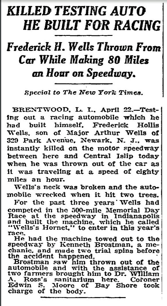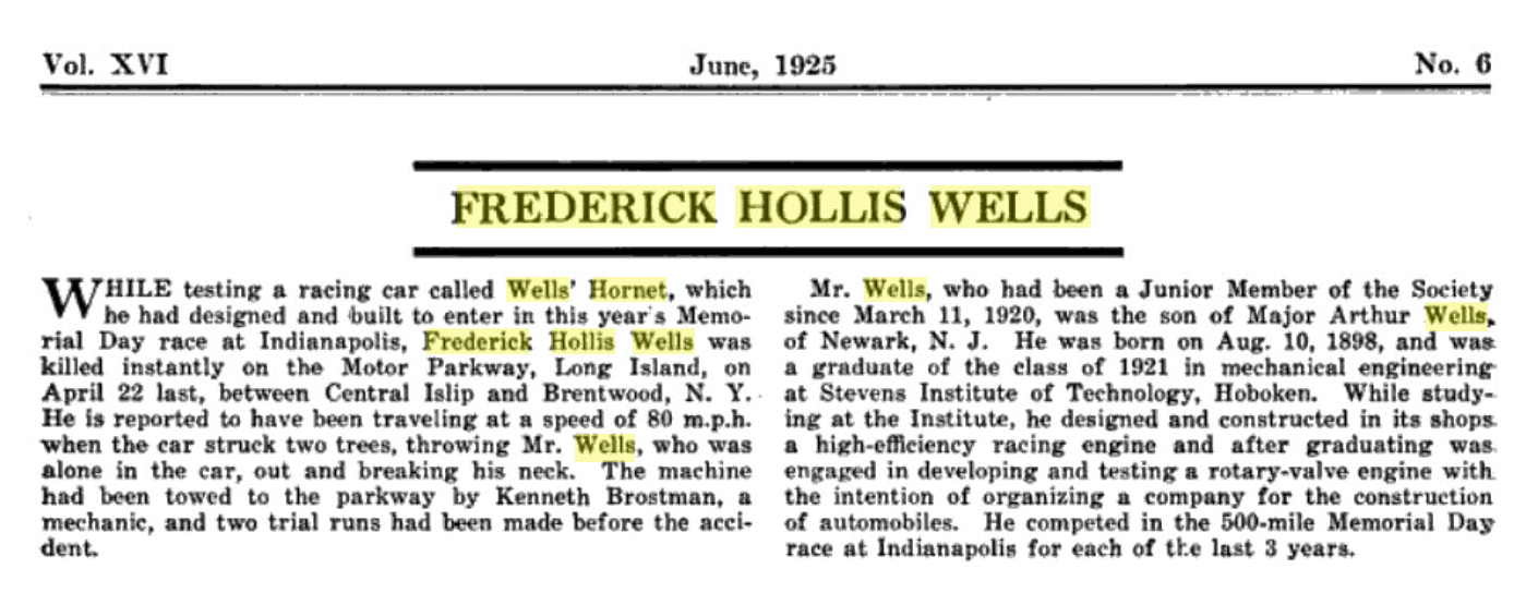 According to the Times, Frederick Hollis Wells had competed in the Indy 500 for the previous three years and had built "Well's Hornet" to enter in the 1925 race.