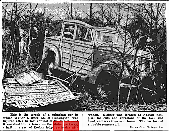 As reported in the Nassau Daily Review-Star, on March 11th, 1938, this woody wagon rolled off the parkway a 1/2 mile east of the Roslyn lodge.