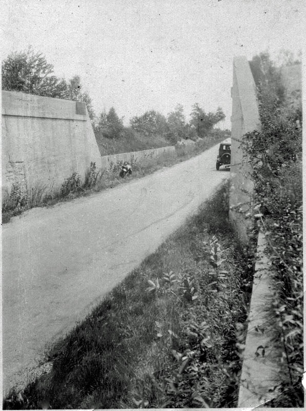 The well-known wreck seen below the parkway at the Clinton Road Bridge. This was included because the Clinton Road Bridge was a known dangerous spot along the parkway. So may accidents happened here that lawsuits continued well into the 1940's. When the bridge was removed just after the parkway closed, one newspaper was quoted as saying it was an end to the 'Bloody period of death and destruction'.