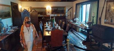 Moving into the dining room as our docent Kathy points out various artifacts in and around the room. Beautiful Spanish tiles, hand carved ceiling from the 1920's that mimic ceilings found in European castles, and the Vanderbilt coat of arms over the fireplace.