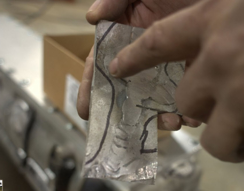 Steve points out, Magnante-style, how every weld is shadowed by a crack. You can see how that hairline extends off to the left in the 11 o’clock position. This meant that they had to cut out many very large sections.