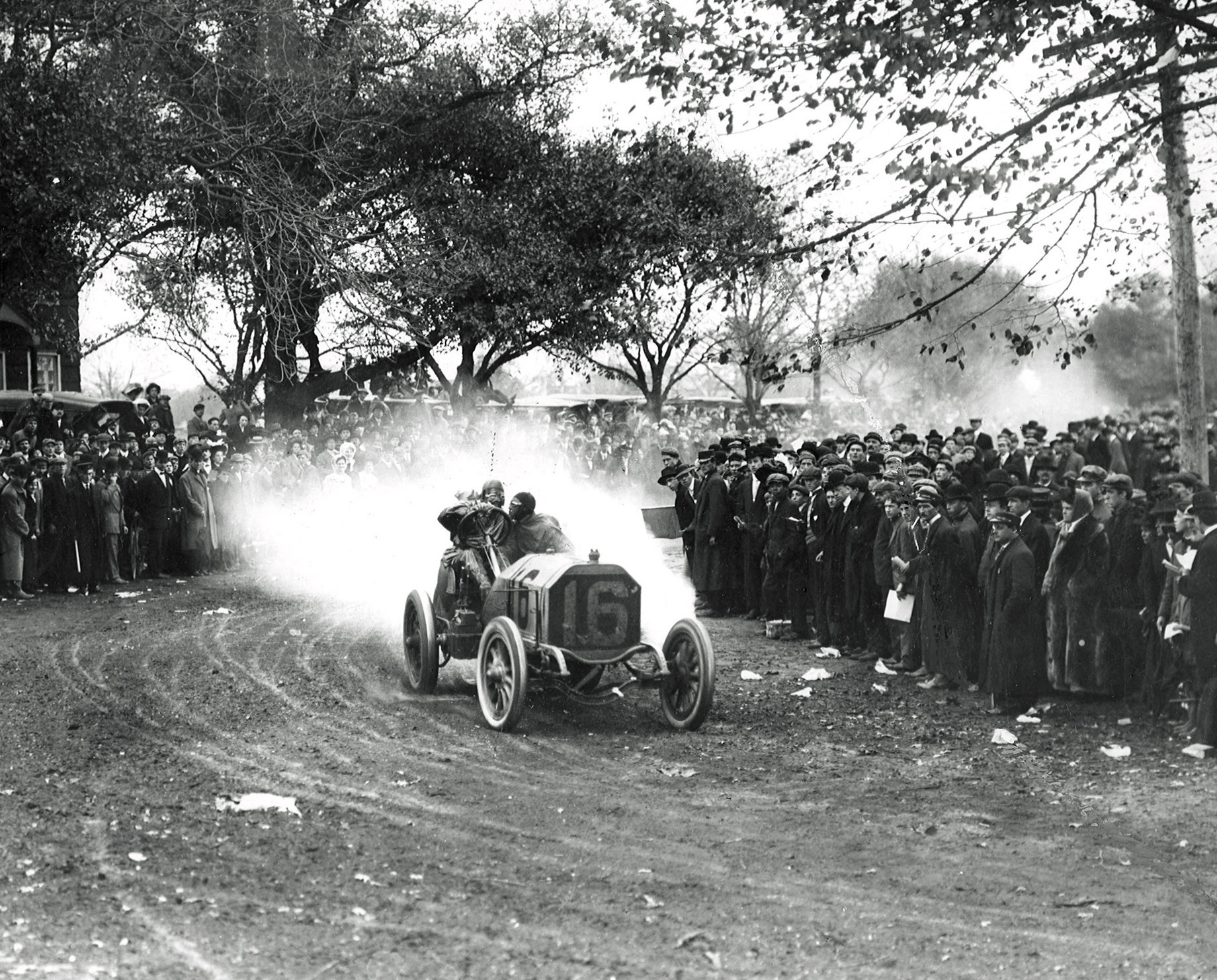 George Robertson's 1908 Locomobile racer rounds the Westbury turn in the 1908 race. Note the perilous proximity of the crowd.