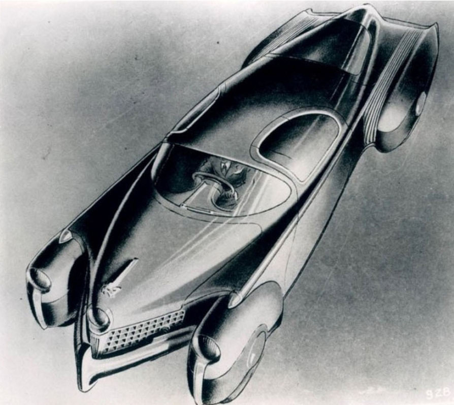 In response, Lawson dug up a circa 1939 drawing he did while in charge of the Buick studio for GM’s Art and Colour. The drawing, which featured a center driving position, cyclops headlamp, bifurcated eggcrate grille, and swoopy lines, led to his dismissal from GM – Harlow Curtice found it far too advanced – but Lawson felt it fit the bill. To it he added a more canopy-like greenhouse and headlamps atop cycle fenders intended to turn with the front wheels. From that rendering, Lawson sculpted a clay model that appeared lifelike enough to warrant a photo shoot treating it as if it were a full-scale prototype.