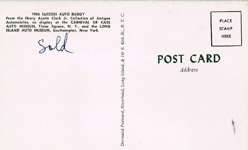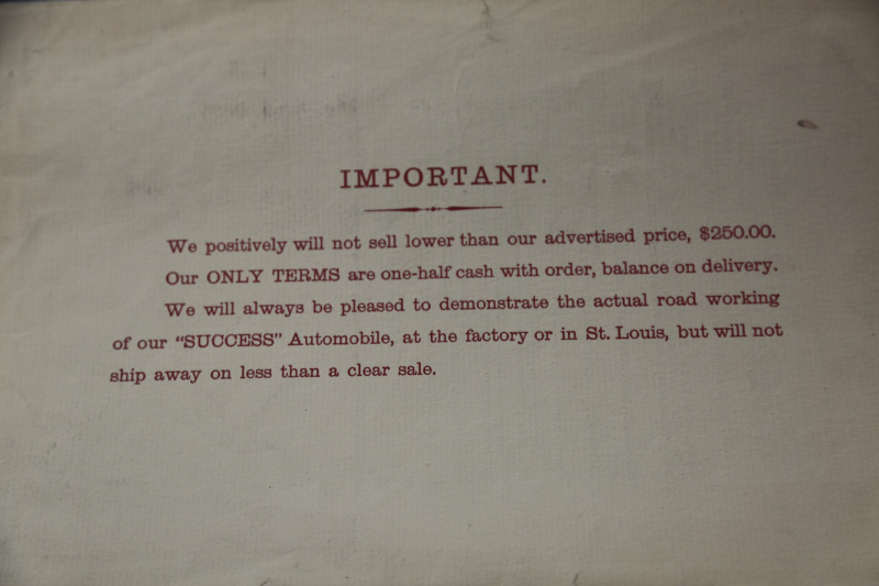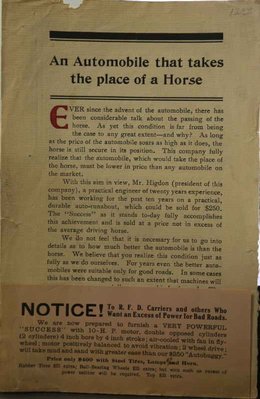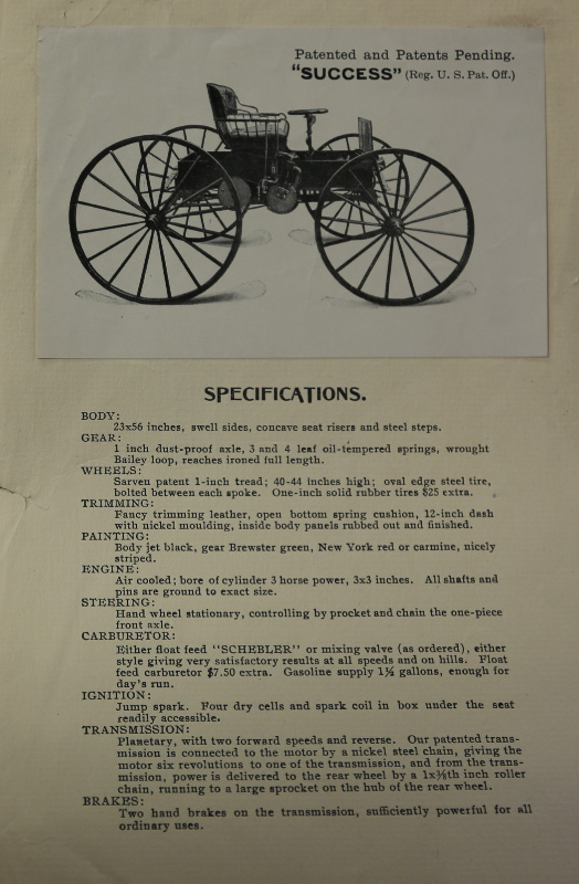 The 1906 Success was promoted as "an automobile that takes the place of a horse" for the cost of $250.