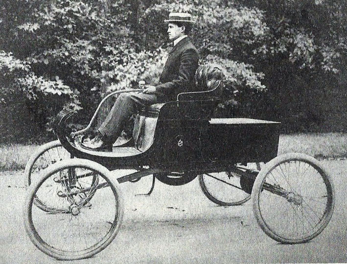 Roy Chapin, Oldsmobile sales chief and test driver, in a 1901 Curved Dash.