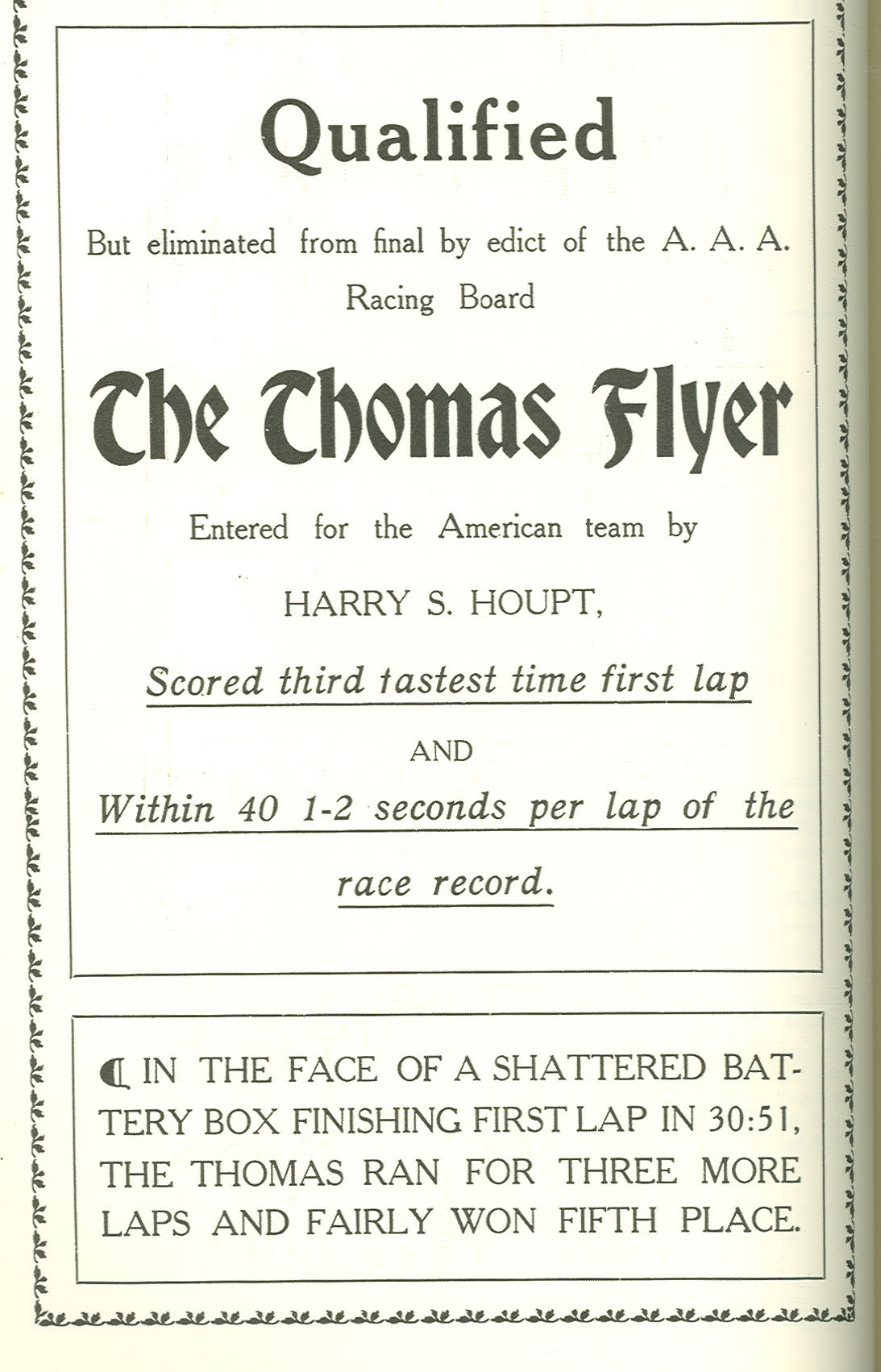 Despite finishing 5th, the Thomas was not selected by the Vanderbilt Cup Commission for the Vanderbilt Cup Race. Harry Houpt, who entered the Thomas, complained, “They have no right to take my $500 and make me spend $1,200 and then throw me out without a hearing.” The Thomas Company reinforced their displeasure with the decision by placing an ad in the official program for the 1905 Vanderbilt Cup Race.