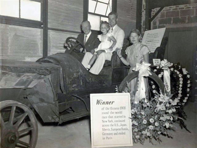 Austin Clark, his wife and daughter with Montague Roberts. The 1907 Thomas Flyer was purchased by Austin Clark for $3,000 in 1948 and sold to William Harrah in the early 1960s. The car is currently exhibited at the National Automobile Museum in Reno Nevada.