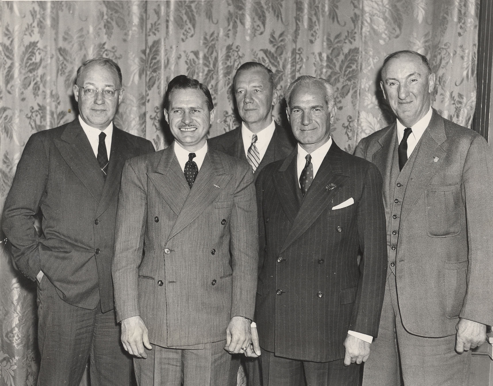Montague Roberts and four other drivers appeared at an Automobile Oldtimers Club meeting in November 1940. Left to right; George Robertson, winner of the 1908 Vanderbilt Cup Race, Wilbur Shaw, three-time winner of the Indy 500, Montague Roberts, Ralph DePalma, winner of the 1912 and 1914 Vanderbilt Cup Races and Cannonball Baker, pioneering motorcyclist and long-distance endurance automobile racer.