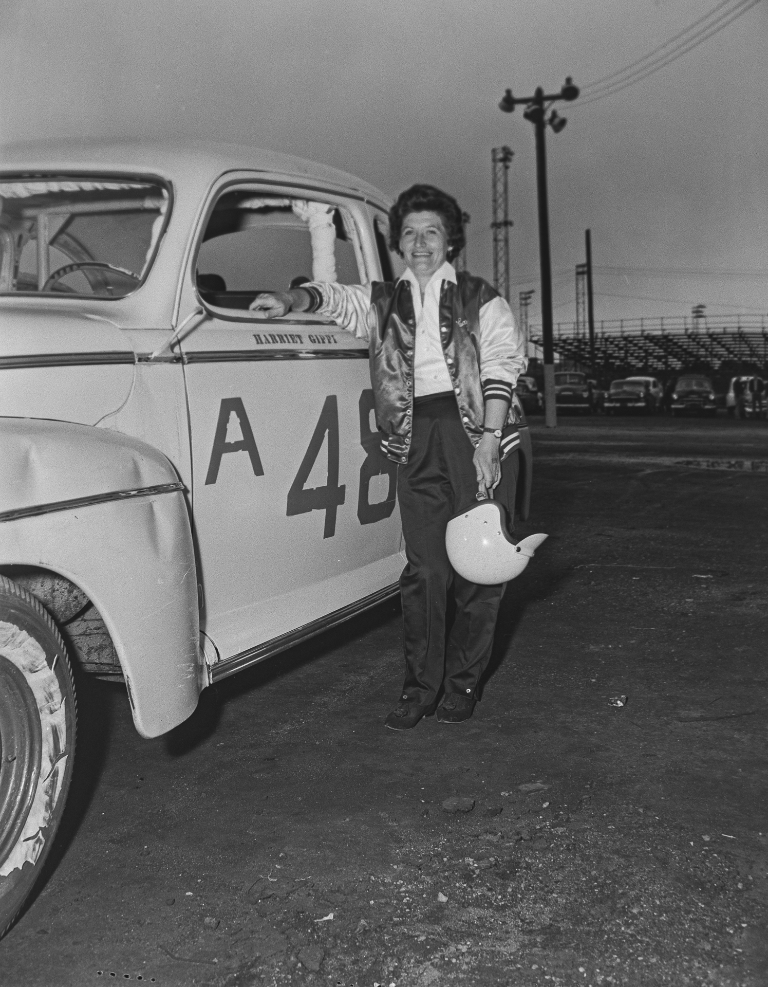 Woman drivers gave the boys a run for their money. Pictured here is Harriet Gippi with her Ford stock car.