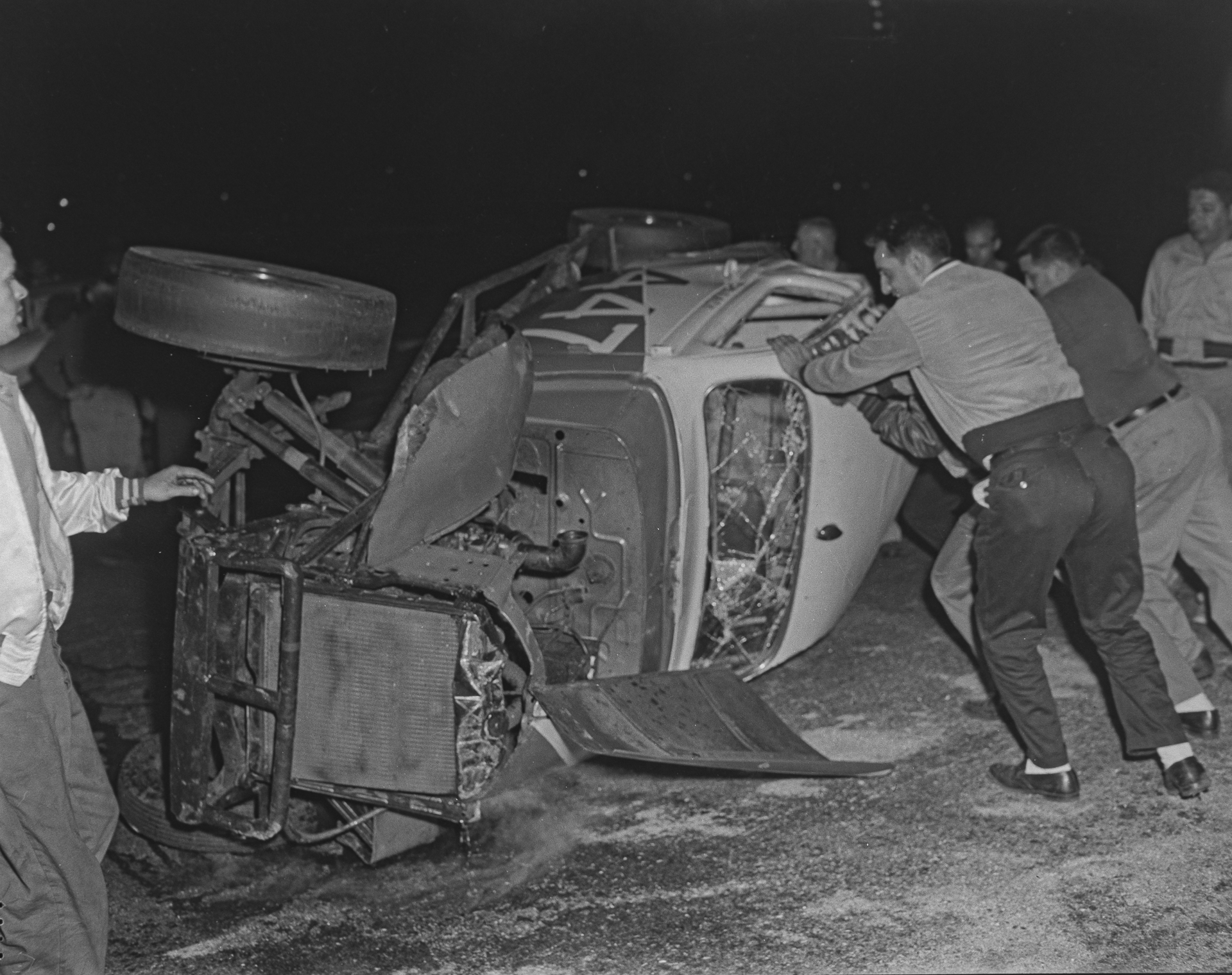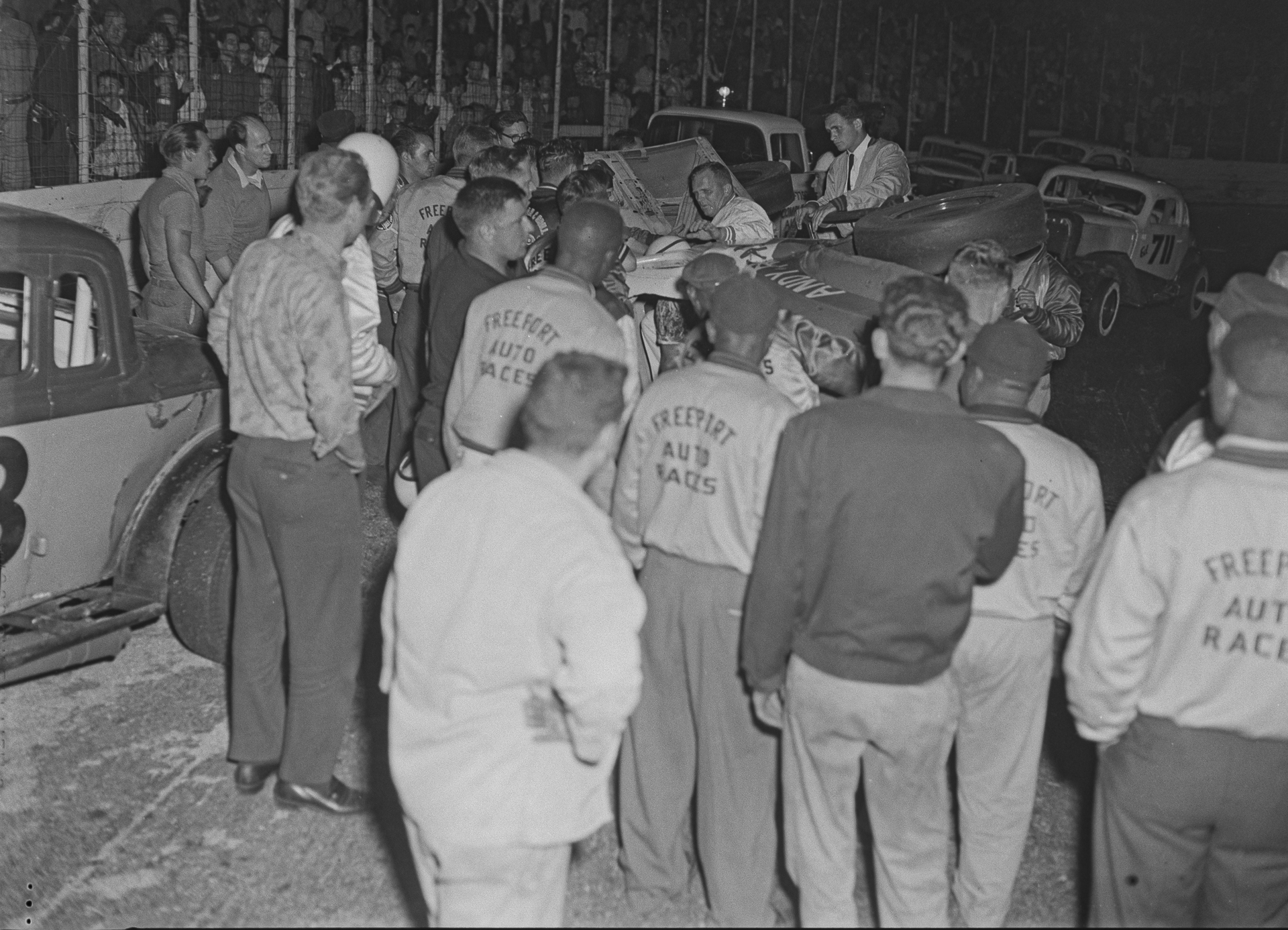 A crowd of Freeport Stadium Racing Marshals huddle around Andy Spies‘s rolled-over Plymouth race car during a Modified division race. Thankfully, he appears unharmed and is climbing out of the passenger-side window of his wrecked race car.