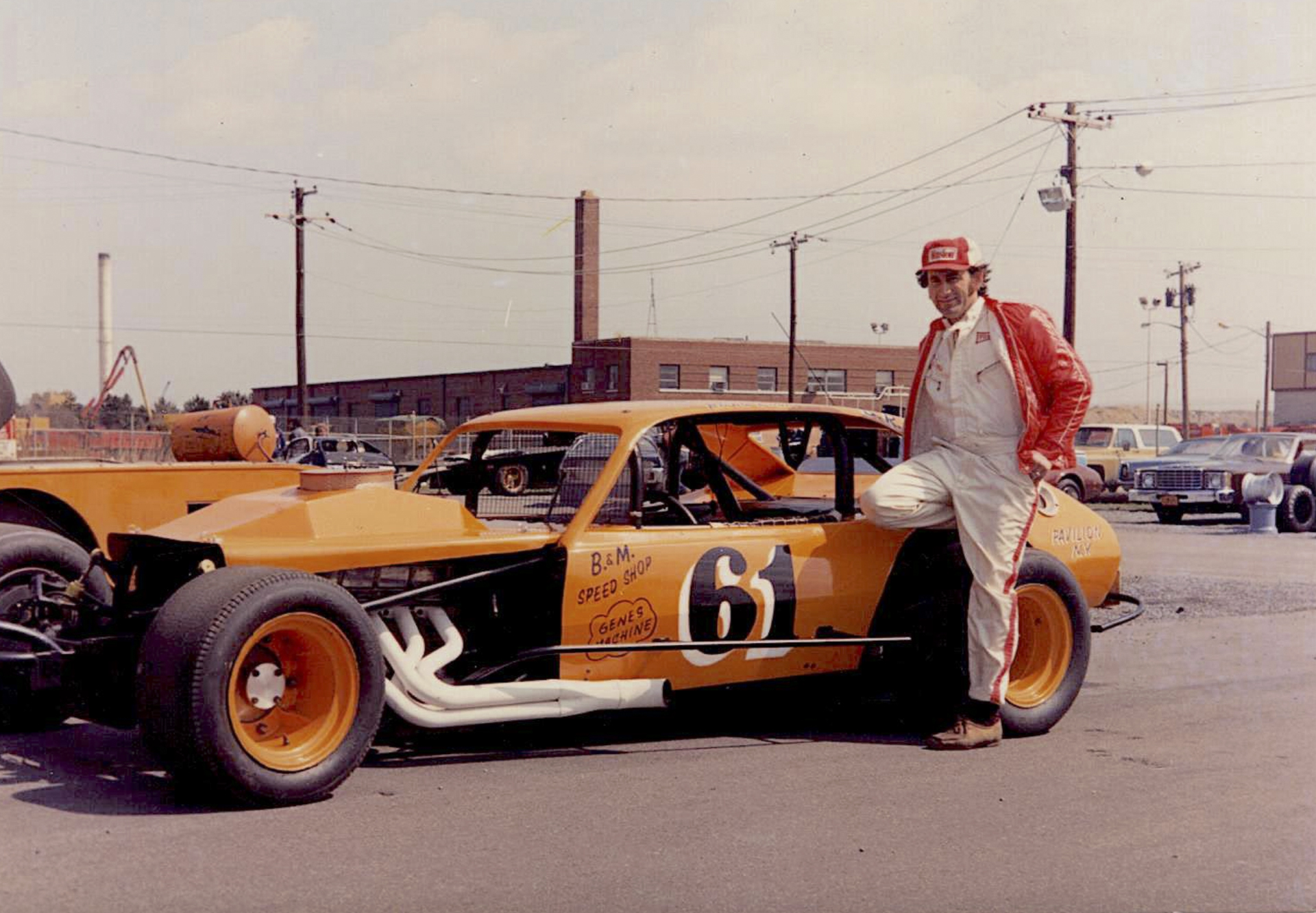 Here is Richie Evans with his modified Ford Pinto in the parking lot at Freeport Stadium.