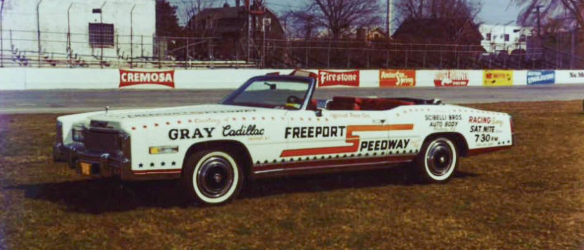After the renovations were completed, the track was renamed Freeport Speedway. Pictured here is the Cadillac pace car for the newly christened venue. The grand reopening races on the remodeled track took place on April 21, 1971.