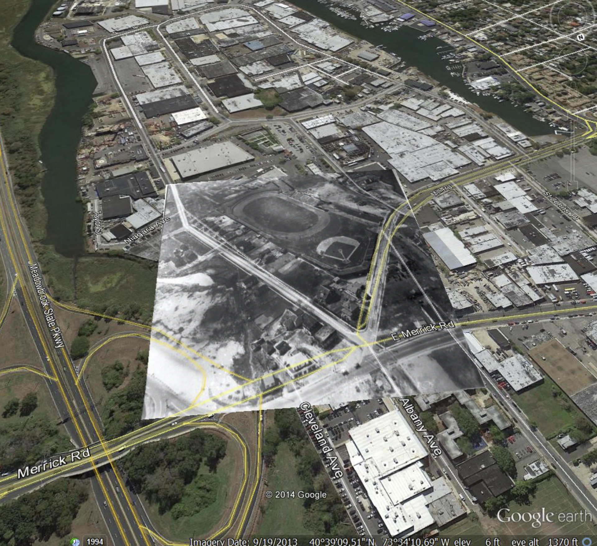 Aerial overlay showing the “ghost” of the Freeport Stadium track on top of a modern aerial photograph of the property today.