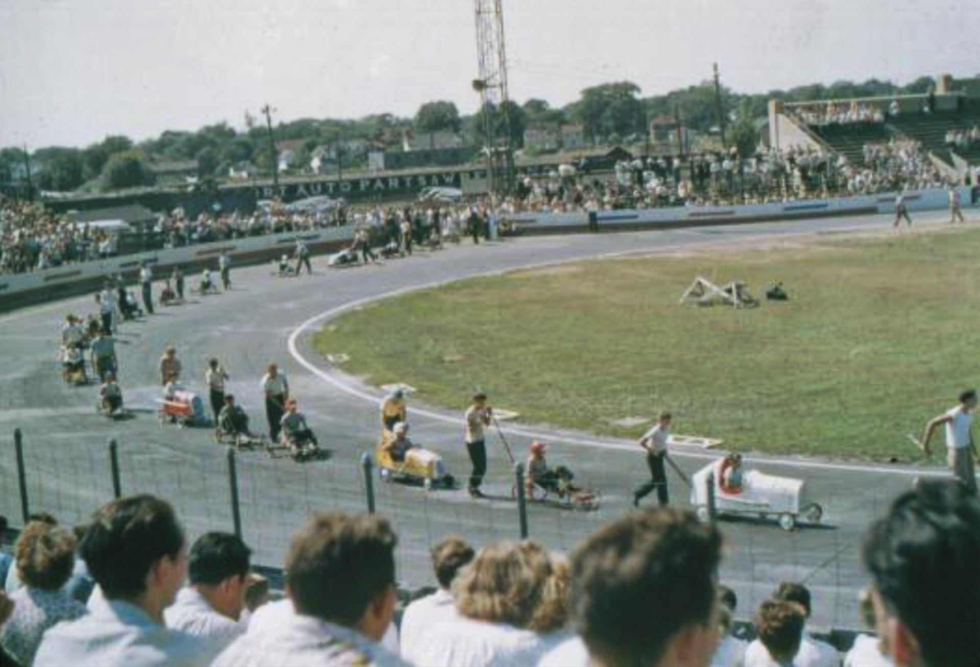 This photograph of a soapbox derby race is a rare treasure. Event photographers typically took a break during intermissions, when soapbox derbies rolled onto the track at many Long Island race tracks. As a result, images like this are scarce in the archives.