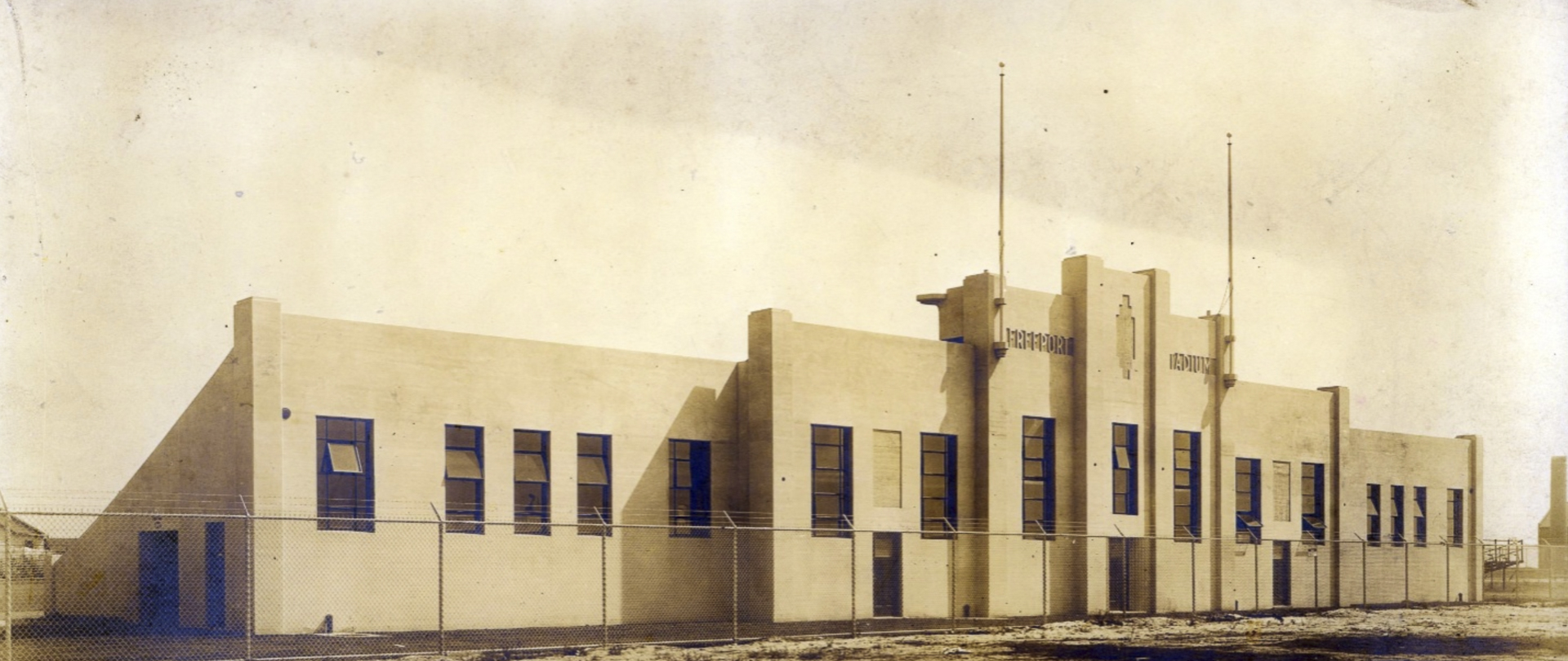 Here is a detailed photo of the Freeport Stadium grandstand seen from the spectator entrance. The building's structure features a subtle Art Deco design.