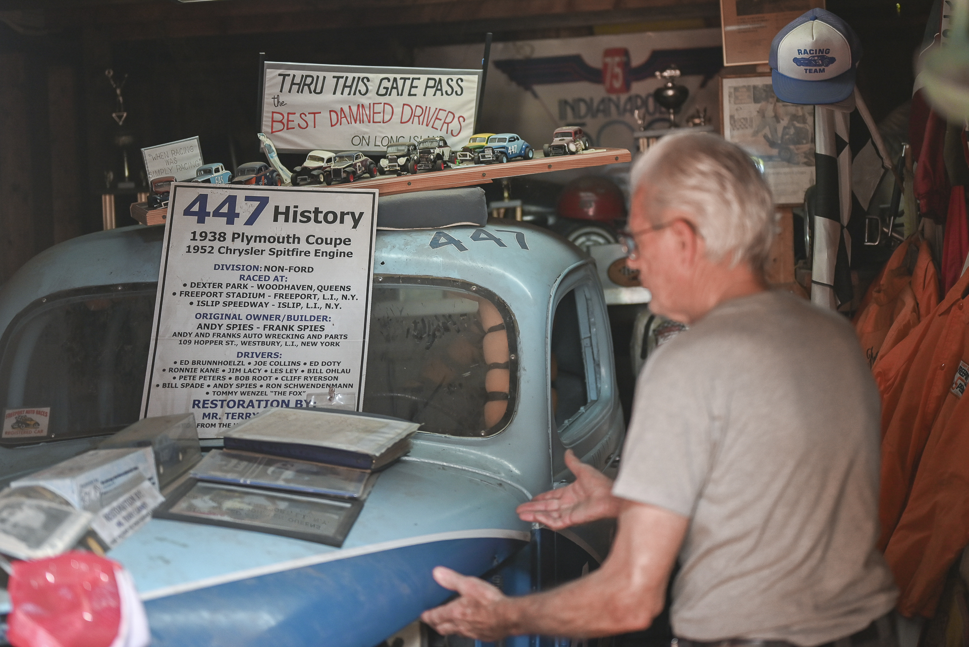 This is the same 1938 Plymouth shown in the two images above. It has had a number of owners and drivers throughout its racing history and was a featured race car on display during Marty Himes's stewardship of the Marty Himes Museum. John Rigney, a close friend of Marty’s, is the current owner and caretaker of the car.