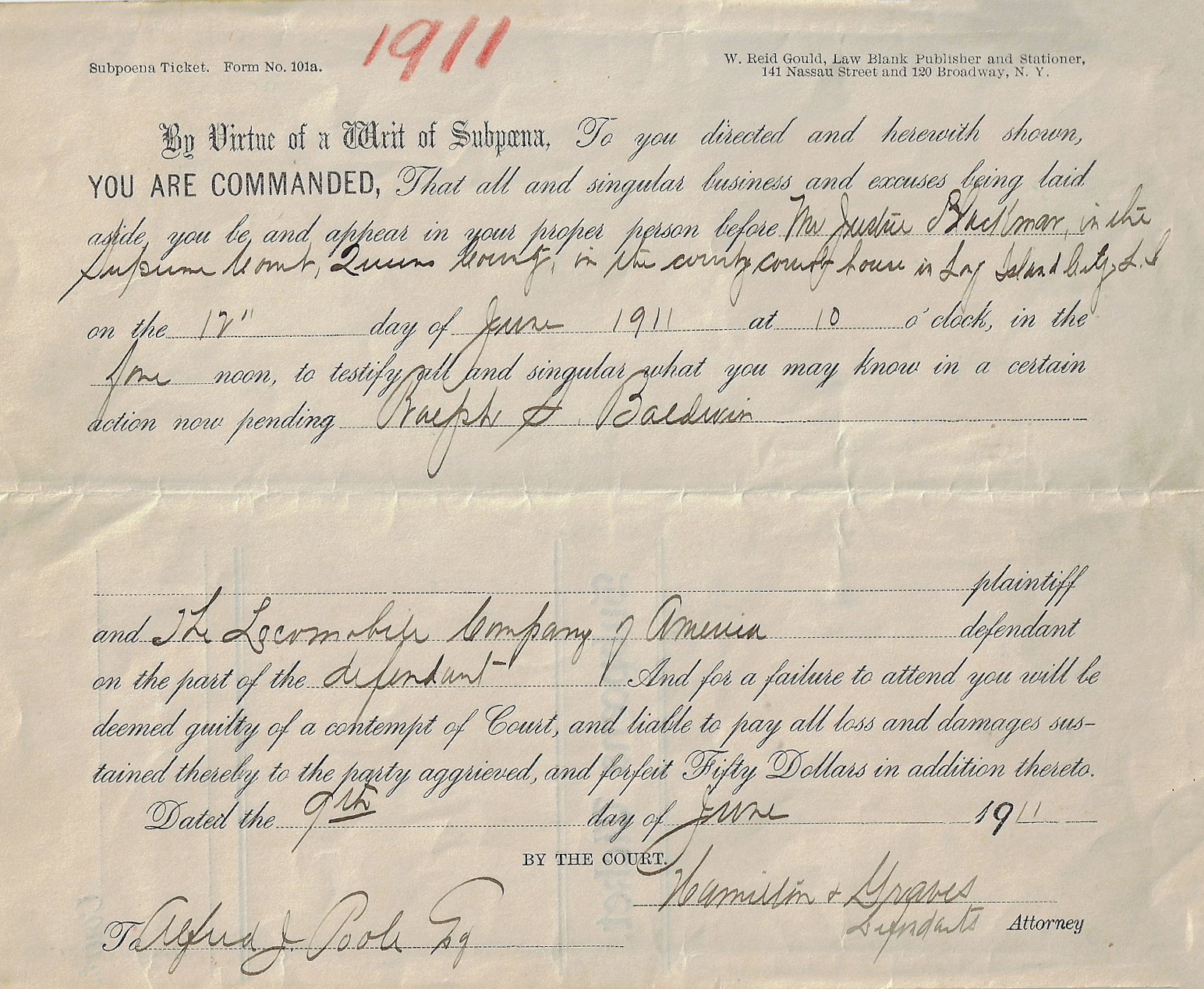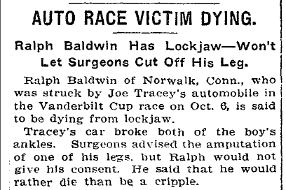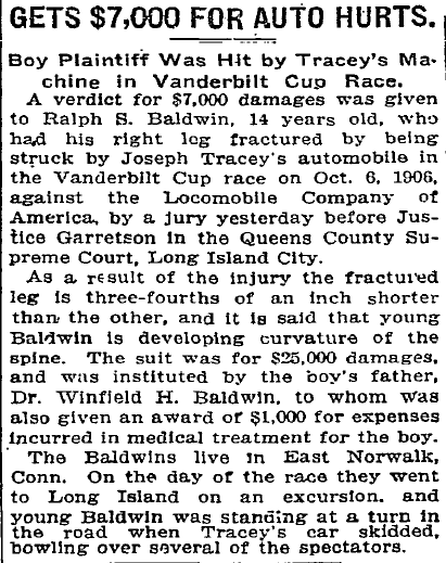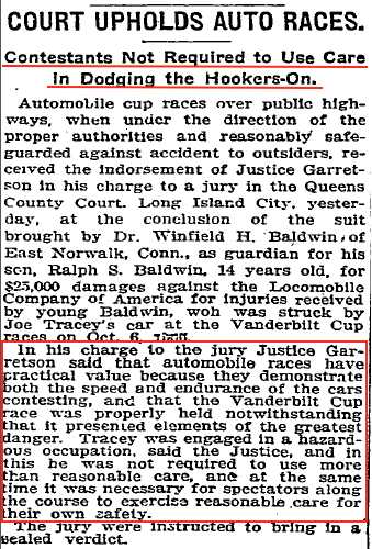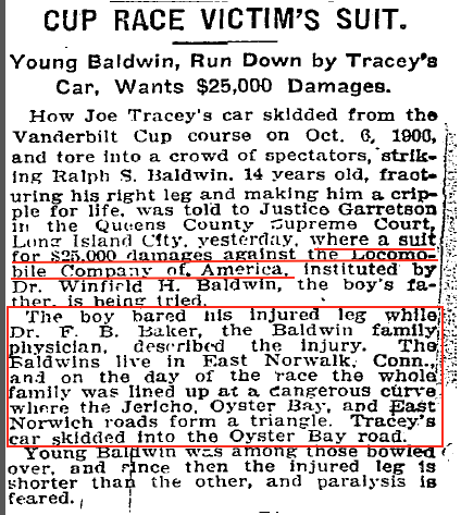 Poole once again was issued a subpoena to appear in court in 1911, this time in Long Island City and related to the 1906 Vanderbilt Cup Race which was marred by several spectator accidents and one death.