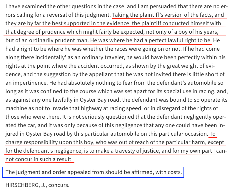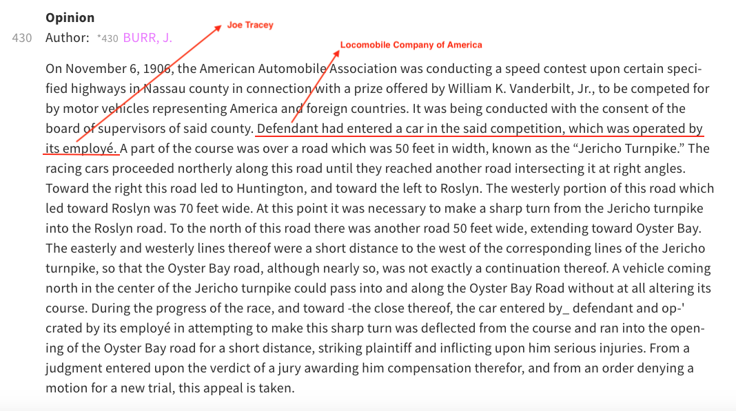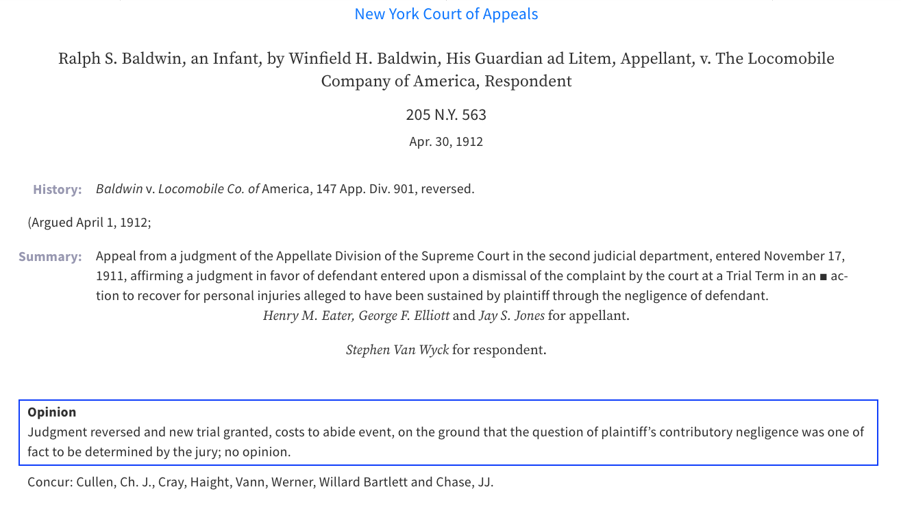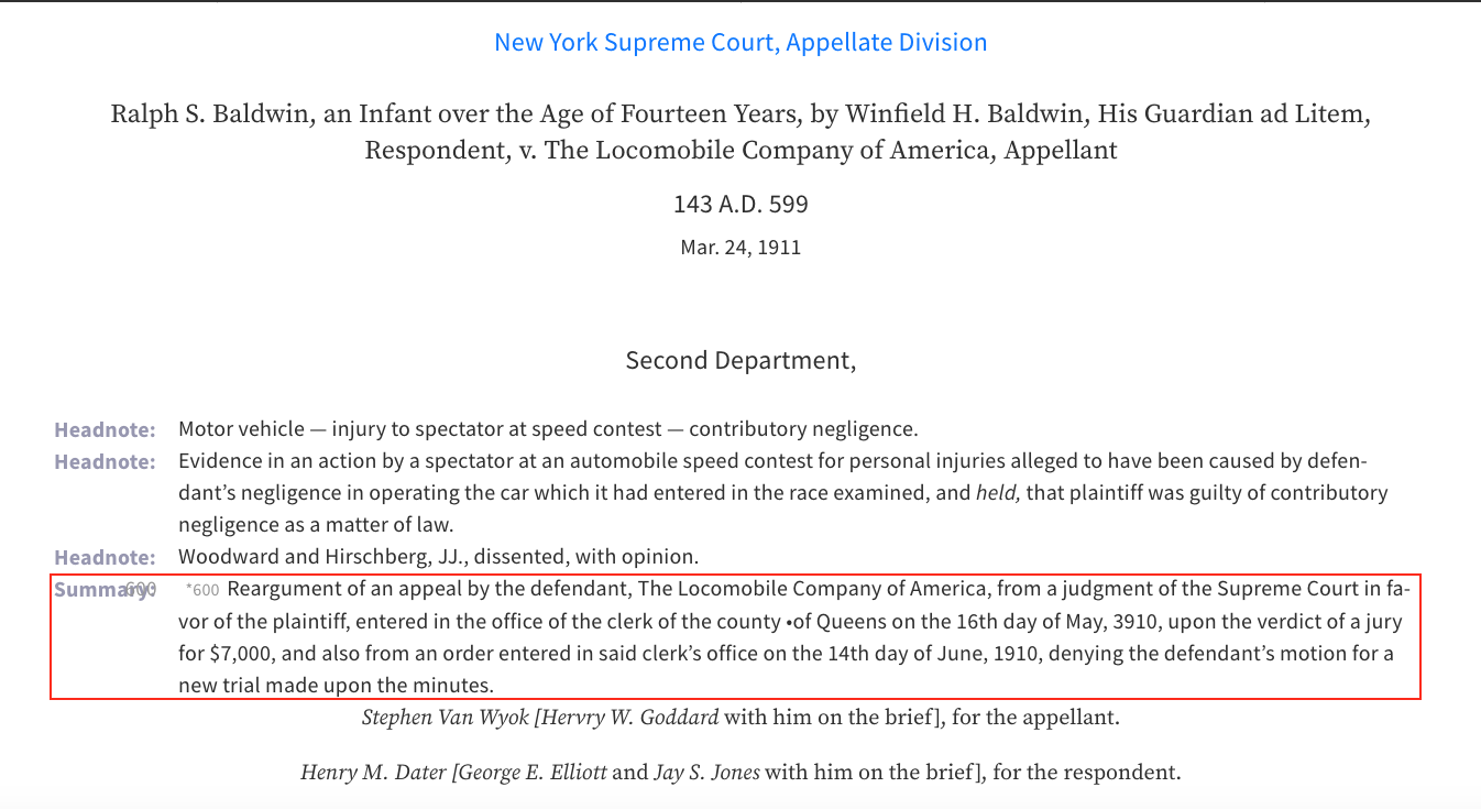 The plaintiff in the case was 14-year old, Ralph Baldwin and his father who were suing the Locomobile Automobile Company of America for negligence on the part of its employee (driver Joe Tracy).