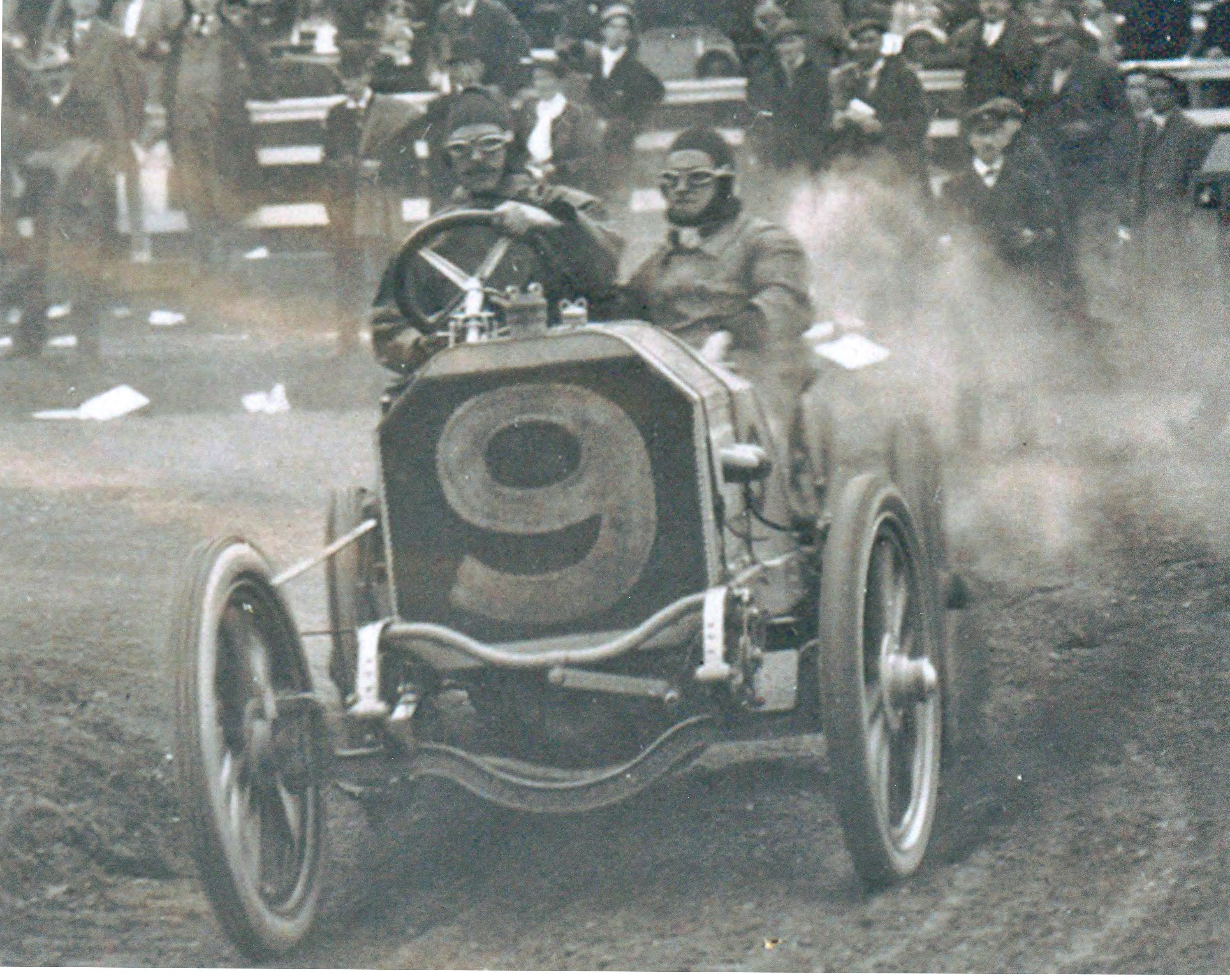 Joe Tracy and Al Poole in the #9 Locomobile during the 1906 Vanderbilt Cup Race.