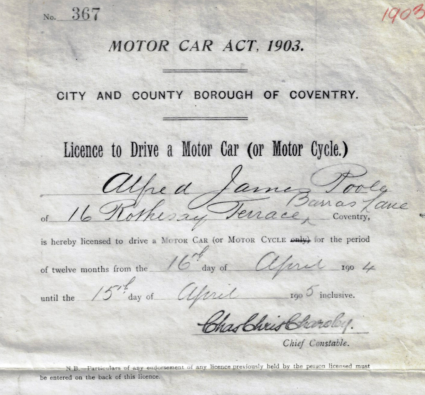 License #367 was issued to Alfred James Poole on April 16, 1904.