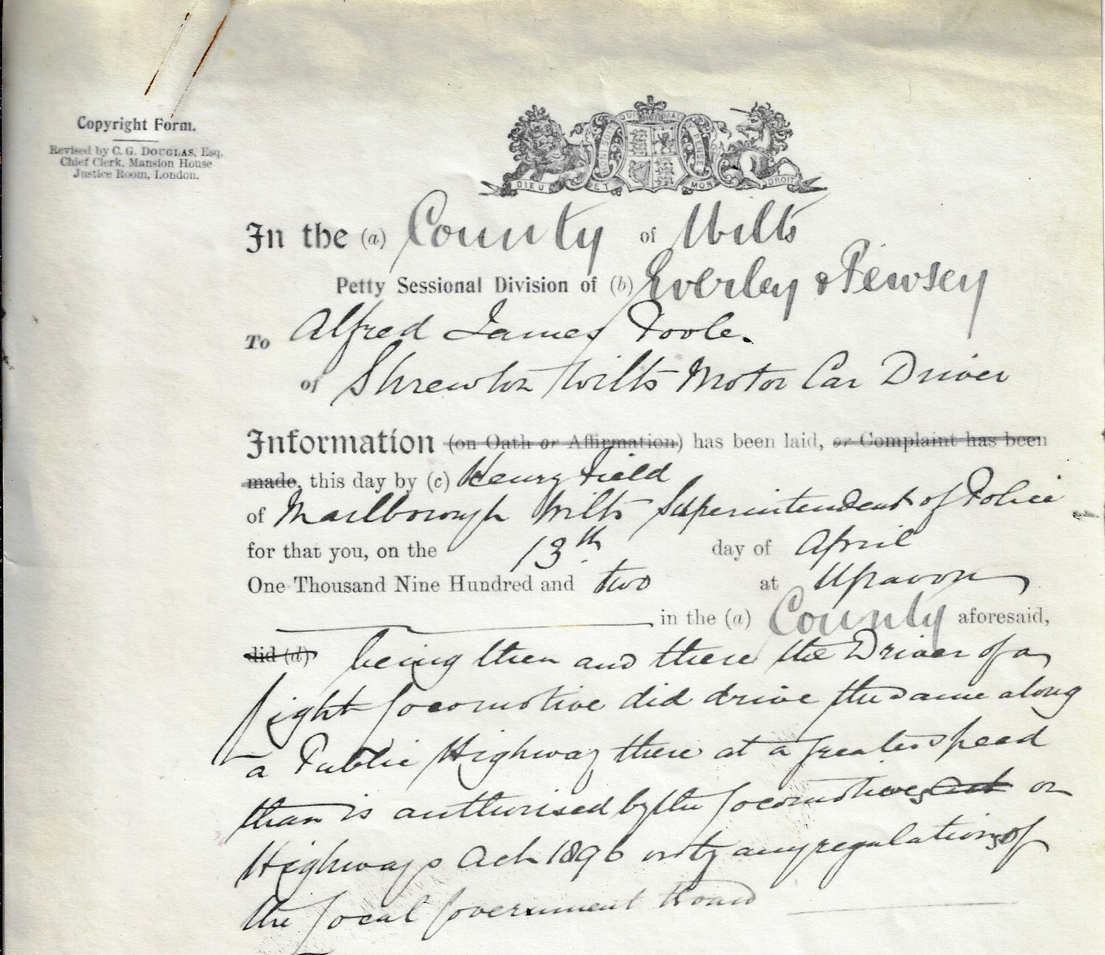 In his home county of Coventry in England, Alfred James Poole was summoned to appear for speeding on April 13, 1902: ". . . as the driver of a light locomotive did drive this auto along a Public Highway there at a greater speed than is authorized by the Locomotives on Highway Act 1896".