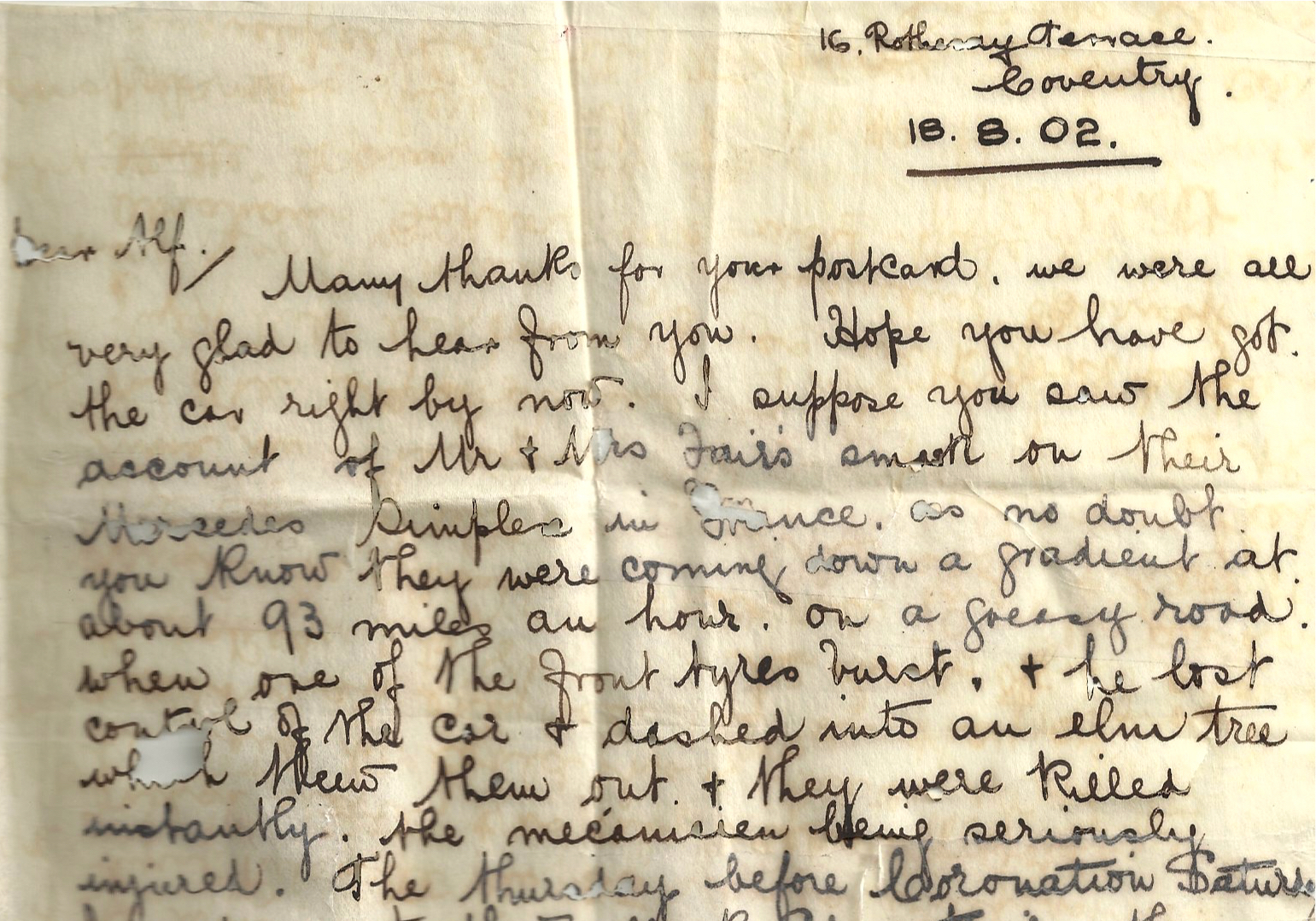 The letter from Poole's brother Alex discusses the death of Mr. & Mrs. Charles Fair (relatives of Willie K.) in France while driving in their Mercedes Simplex at a speed of about 93 mph!