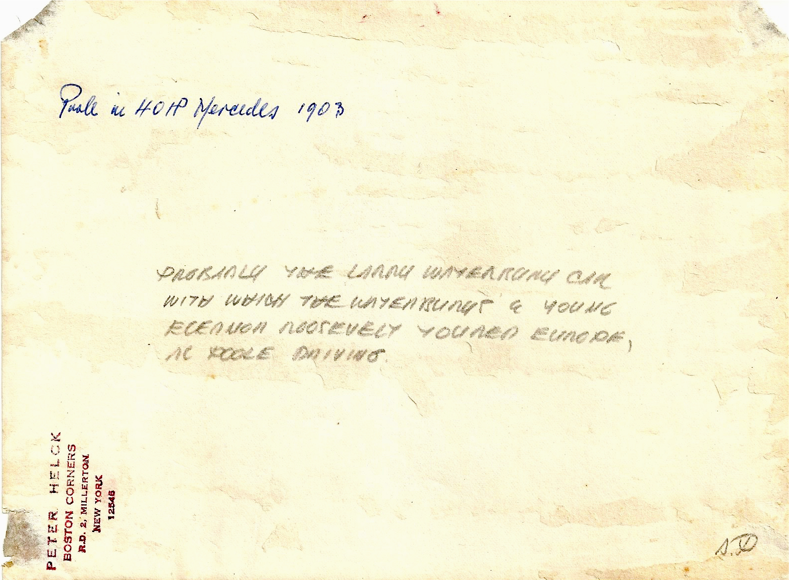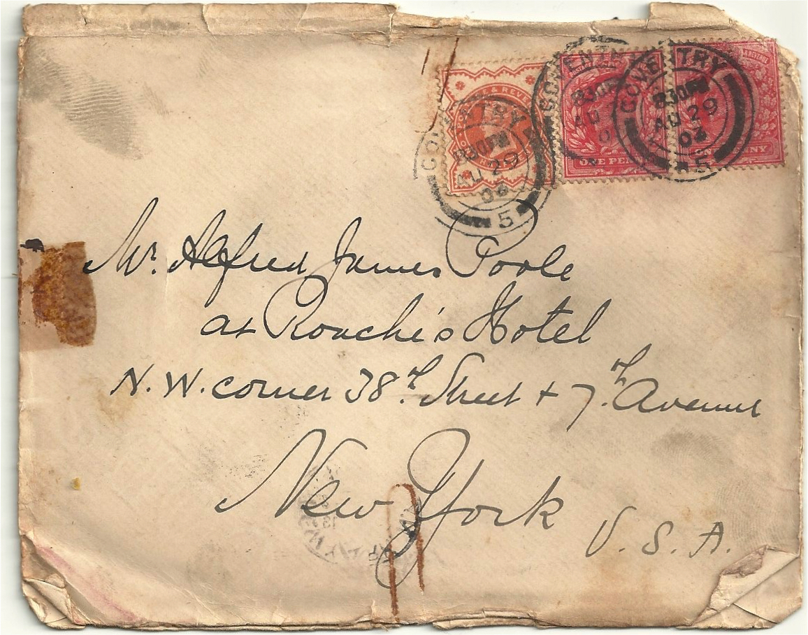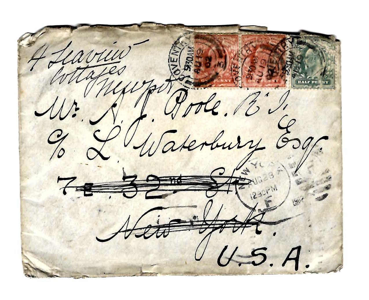 From Alex to Alf. Note that Alex addressed it to Poole c/o L. (Lawrence) Waterbury who employed Poole as chauffer.  Originally sent to NYC it was readdressed to Newport, RI, most likely a favorite spot for Waterbury.