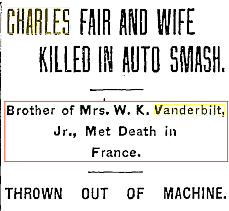 Charles Fair was Willie K's brother-in-law, being the brother of Willie's wife, Virginia Graham Fair (Birdie).  (Brooklyn Daily Eagle, Aug. 14, 1902)