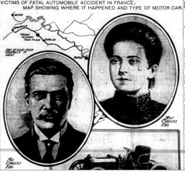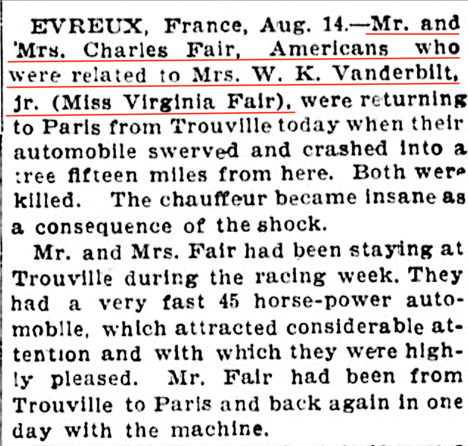 I read with interest the above post. The fatal accident of Mr and Mrs Fair apparently had slipped my memory, but I looked up some information in my archive. It includes a detailed description and comment of the accident in The Motor-Car Journal and in La Vie au Grand Air the last photo of Mr Fair was shown with him standing next to William Vanderbilt who had not long before broken the world speed record with the partly visible Mors. I hope this will be of interest!