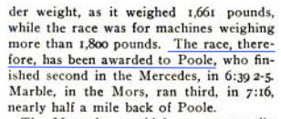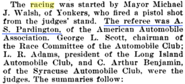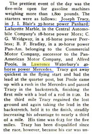 Al Poole often raced Waterbury's 40 H.P. Mercedes including in June of 1903 at the Empire Course near Yonkers, NY going up against his friend to come, Joe Tracey.   And our Motor Parkway friend, Arthur Pardington was there too, as referee.  (Cycle and Automobile Trade Journal)